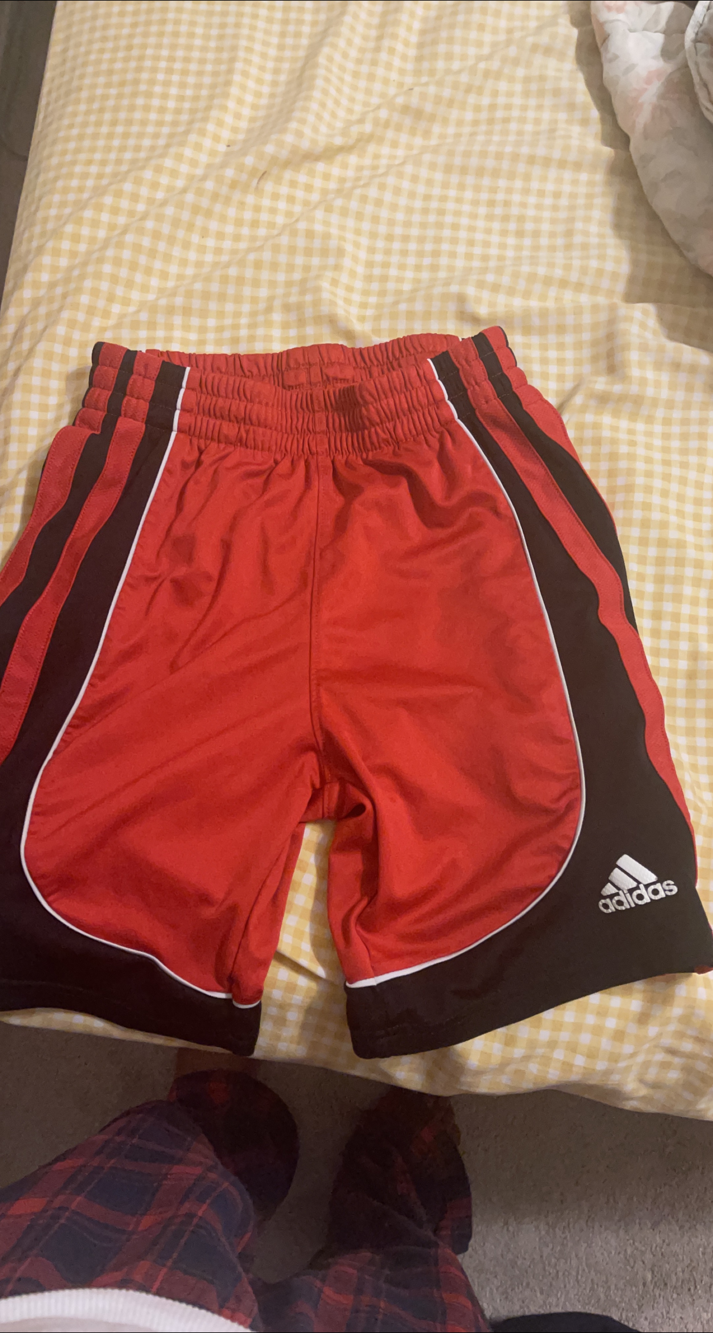 Selling a pair of Adidas athletic shorts in red and black. Great for sports or casual wear!