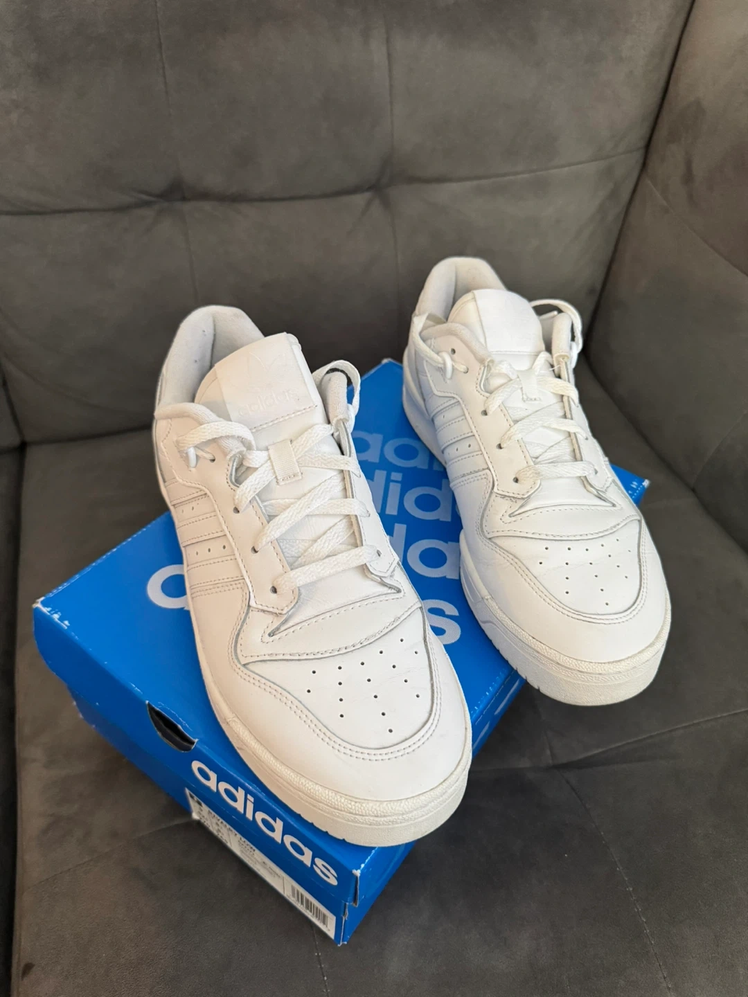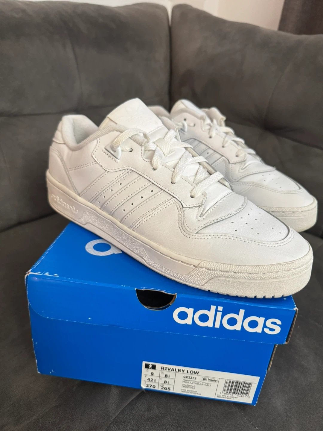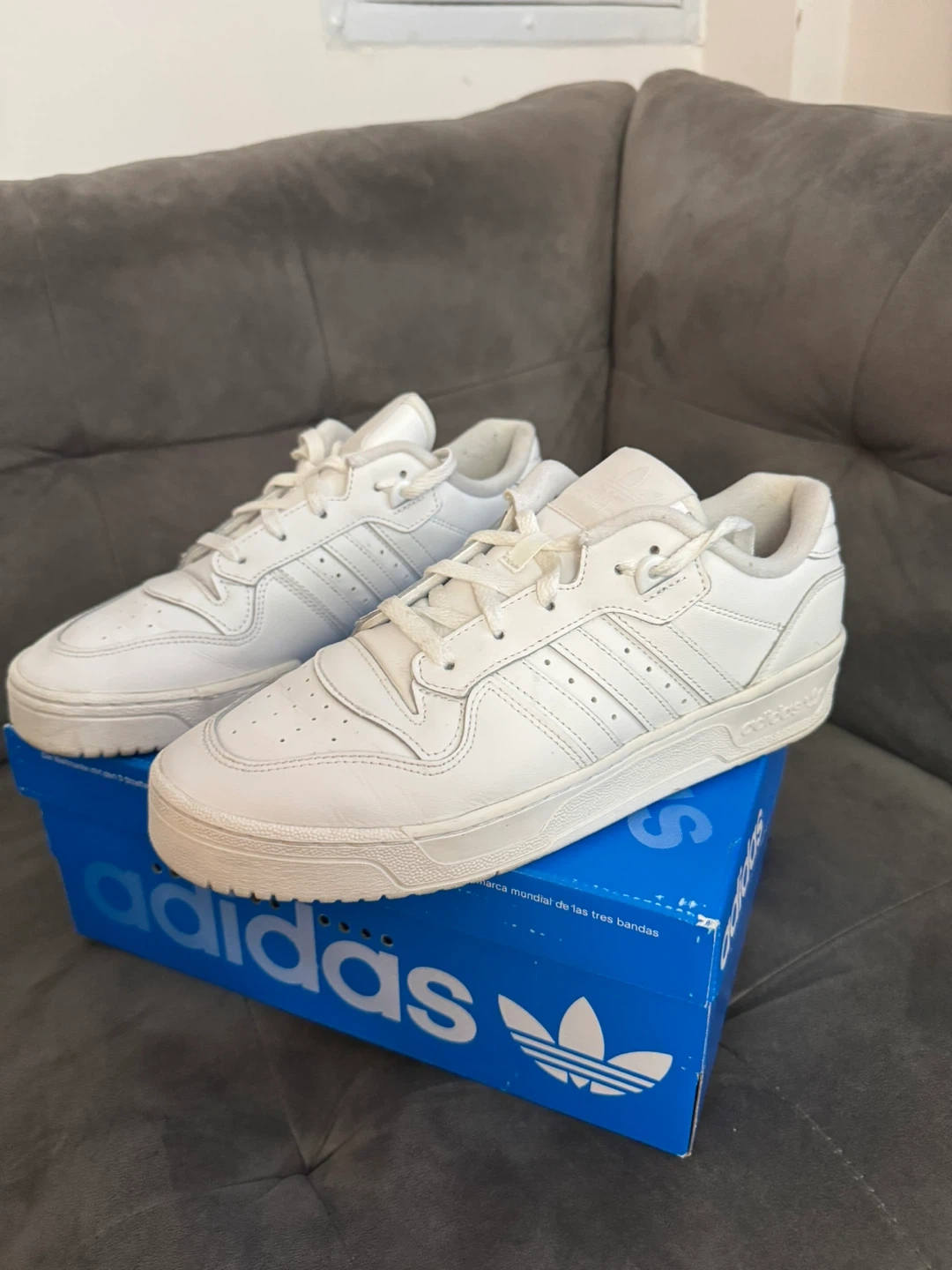 10Selling a pair of Adidas Rivalry Low sneakers in white. They are in great condition and come with the original box. The size is US 9.
