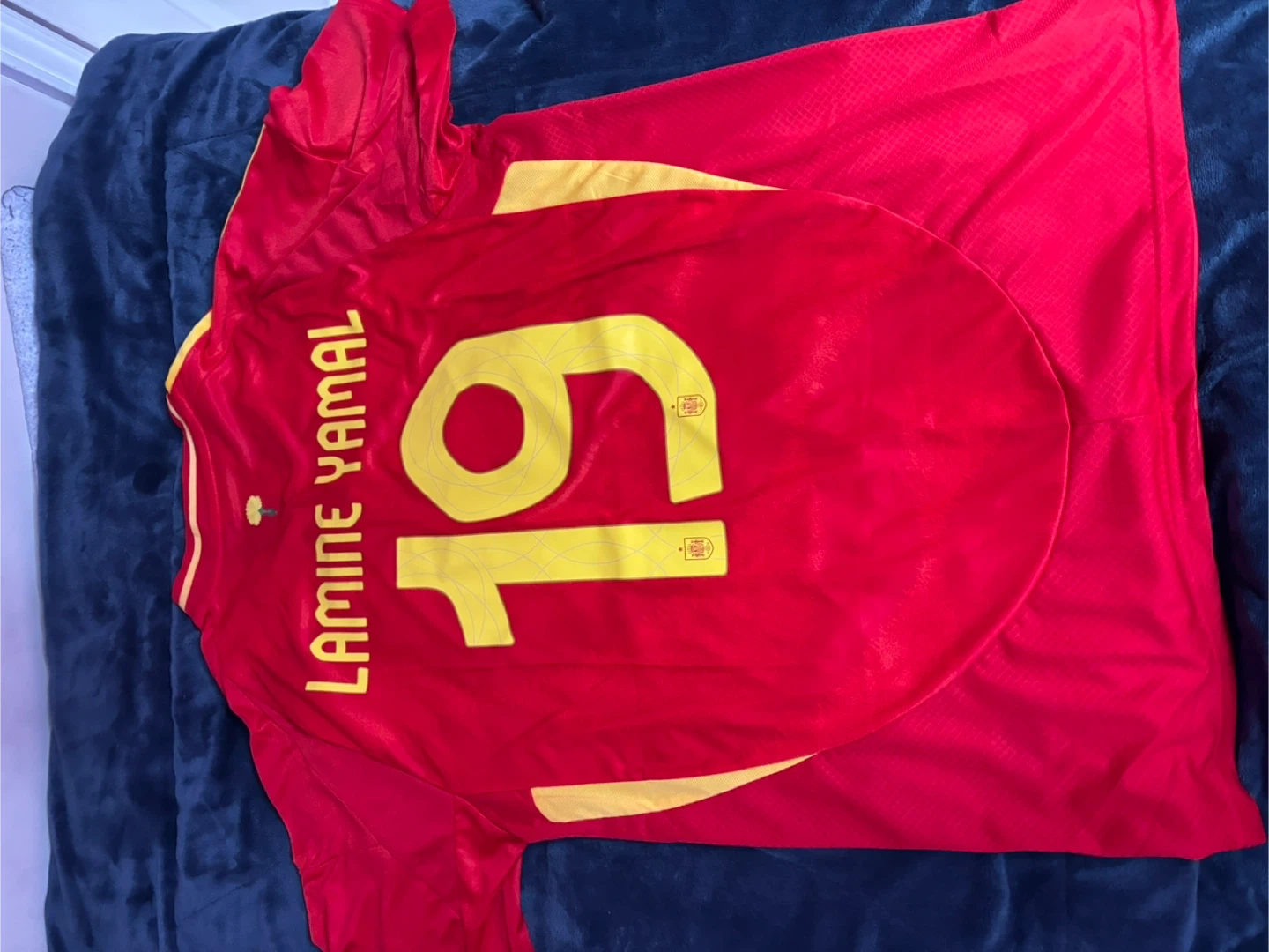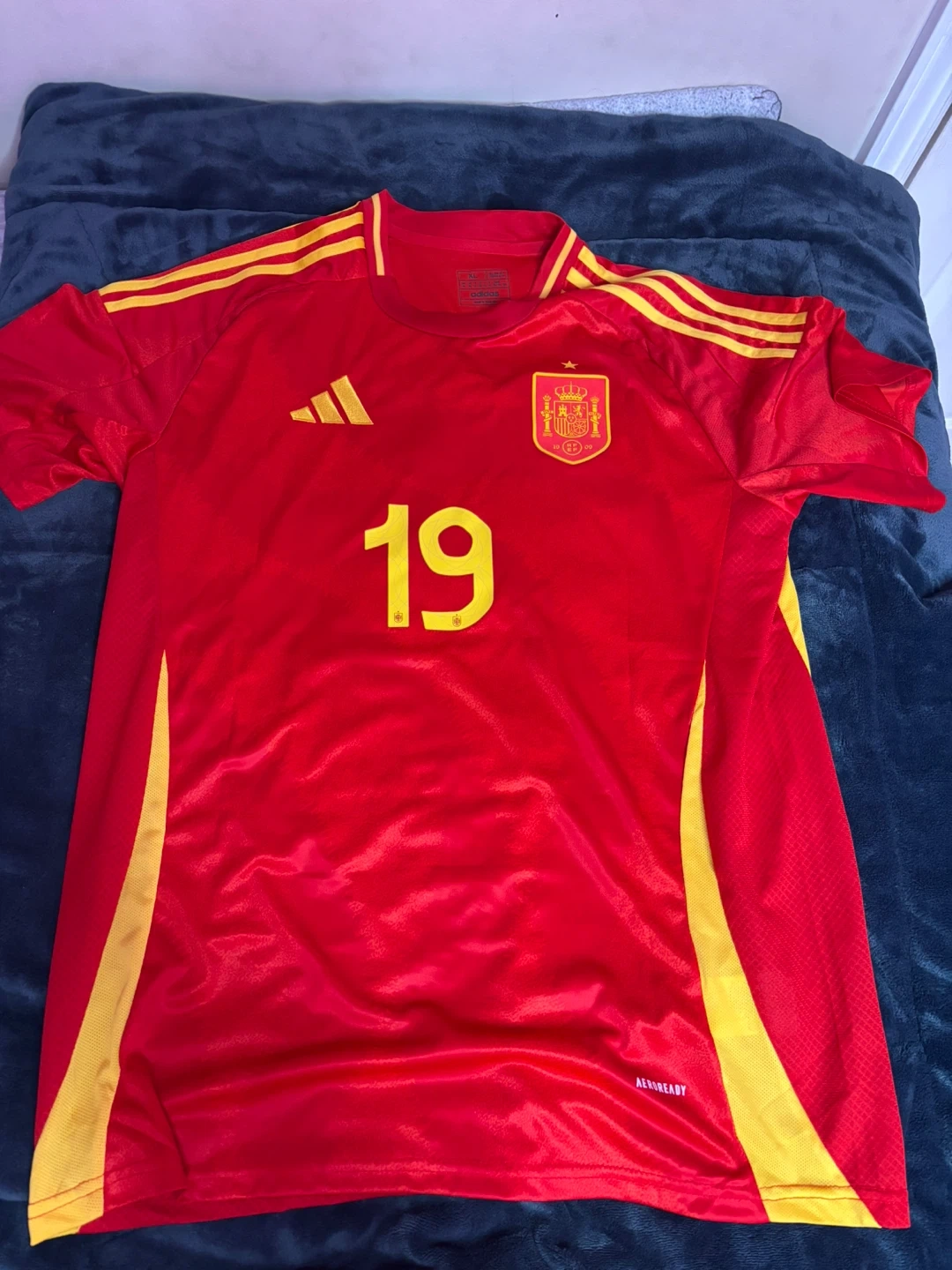 Selling a red Adidas Spain soccer jersey with Lamine Yamal's name and number (19) on the back. Size: XL