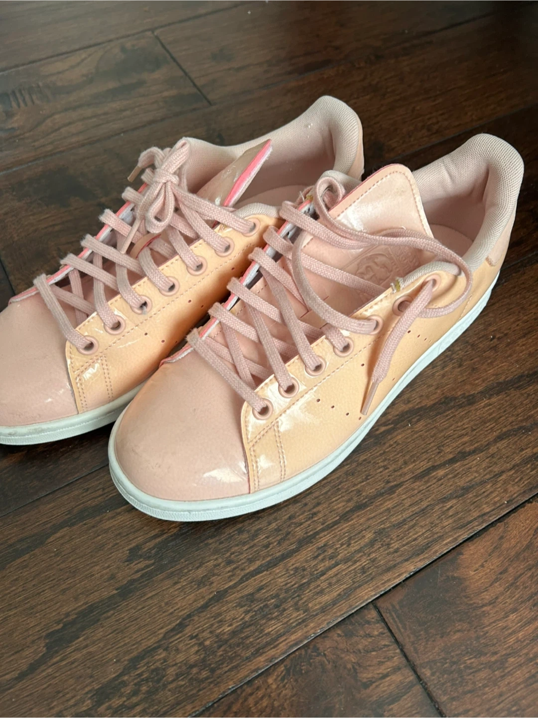 10Selling a pair of Adidas Stan Smith sneakers in a beautiful pink patent leather. They're in great condition and ready for a new home! These stylish and comfortable shoes are perfect for adding a pop of colour to any outfit. Size 71/2