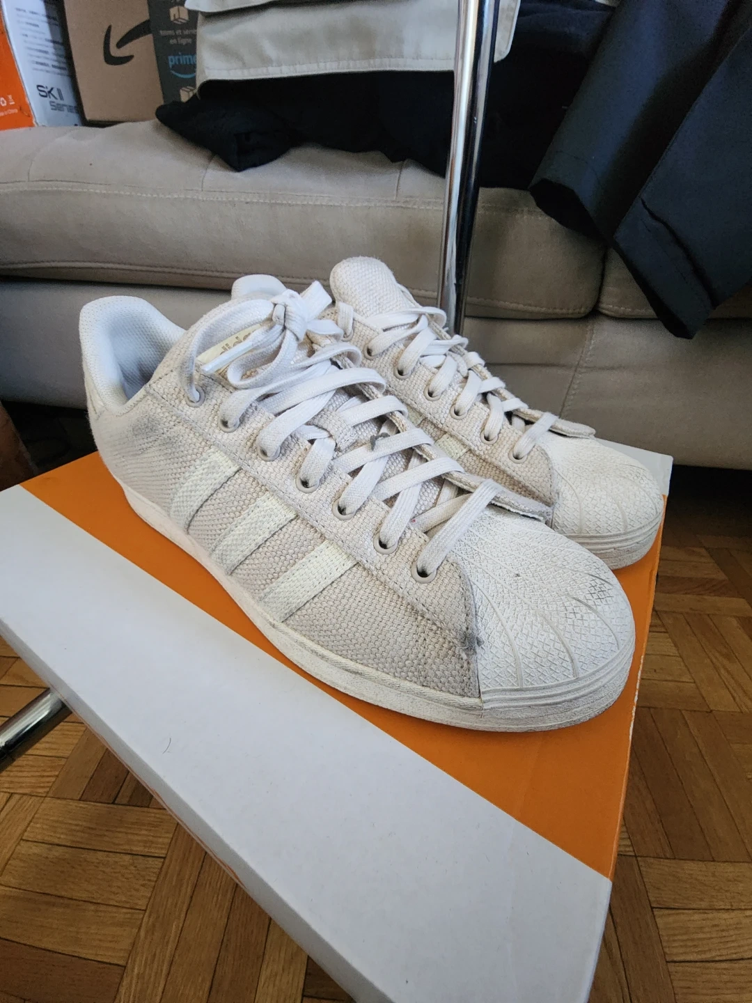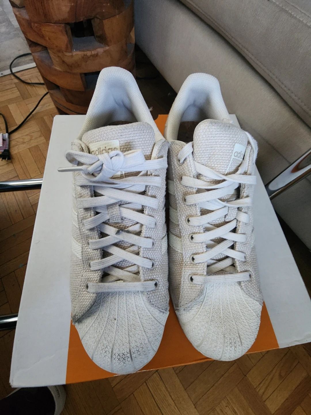 18Selling a pair of Adidas Superstar shoes in a neutral, off-white colour! They're in good used condition and ready for a new home. Size US 10