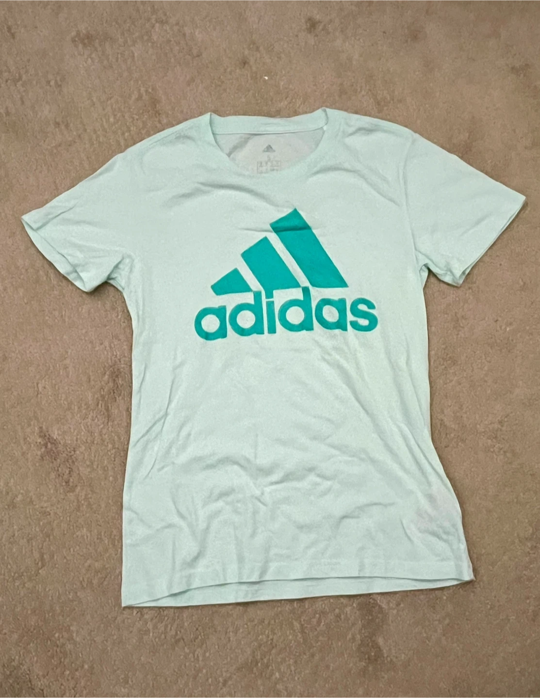 Selling a light green Adidas t-shirt in size small. It's in great condition and features the classic Adidas logo in teal. Perfect for casual wear or workouts!