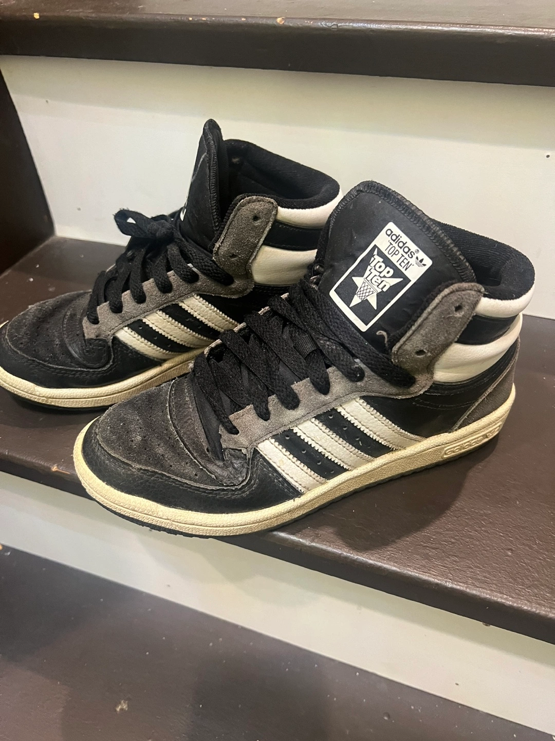 31Selling a pair of Adidas Top Ten high-top sneakers. These are in a black and white colourway and are a youth size 4. They have the classic Adidas stripes and the Top Ten logo on the side. Great for everyday wear!