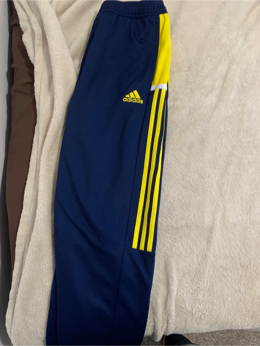 10Adidas track pants in navy blue with yellow stripes and accents! They're in great shape and ready for a new home. Perfect for sports or just lounging around.
