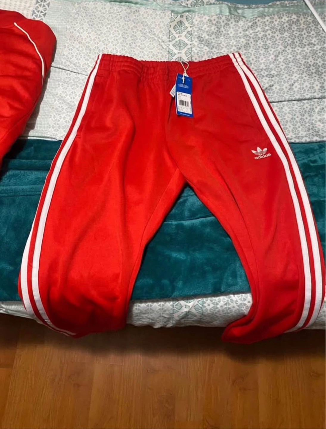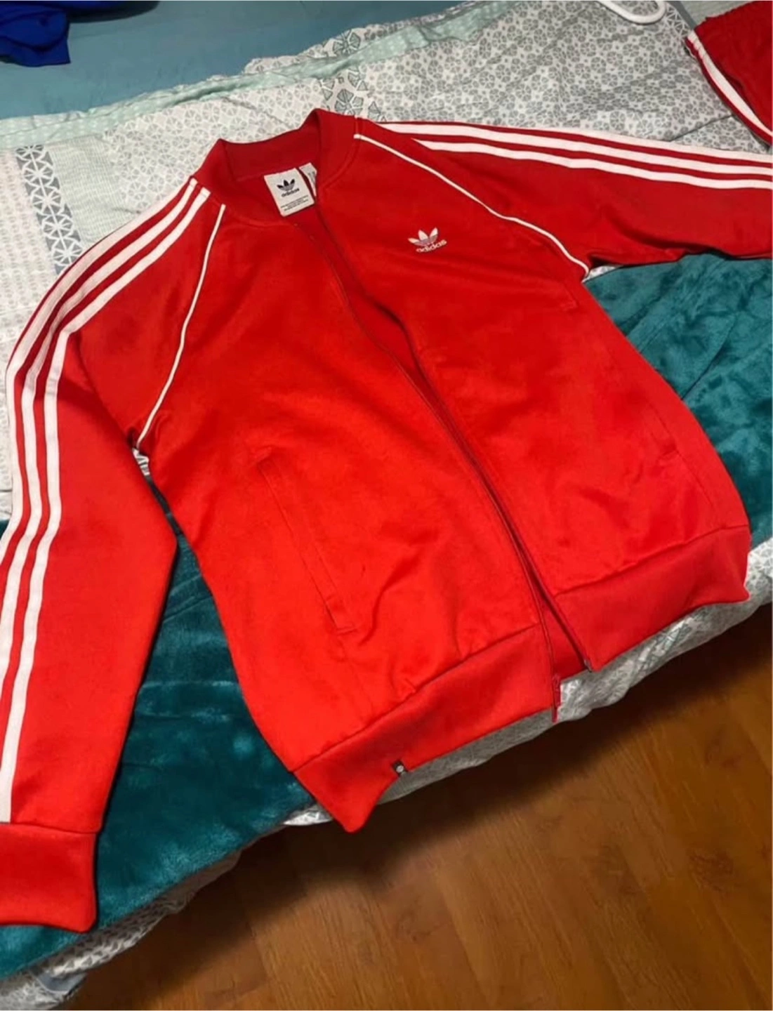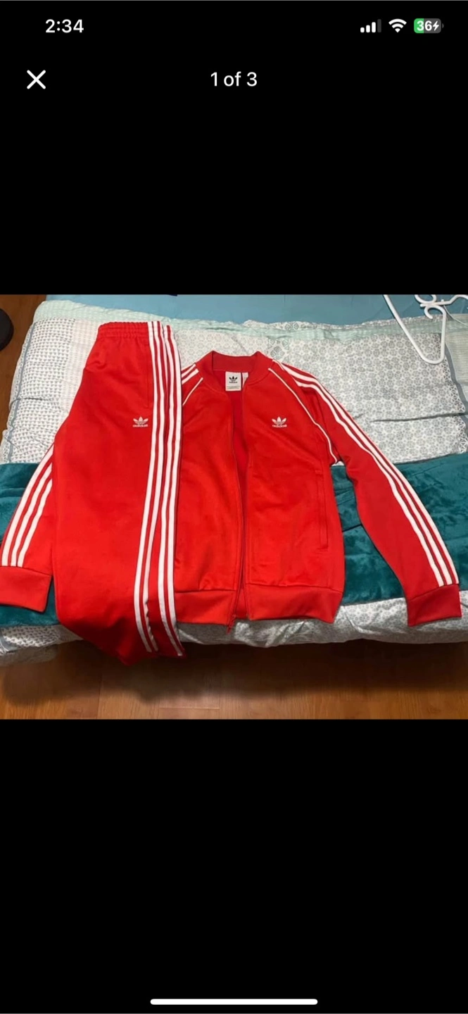 Bright red tracksuit. White stripes down the sides. Zip-up jacket. Matching pants, perfect for your comfort. A good cozy outfit.