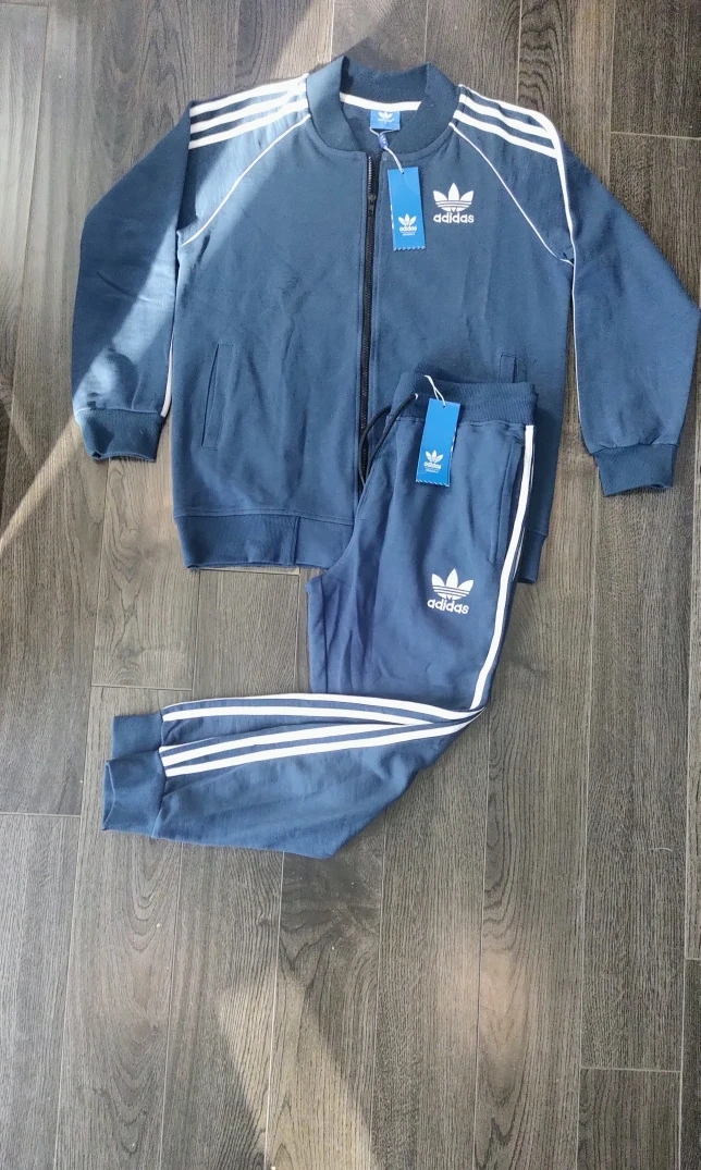 82I have Adidas tracksuits available in black, blue, and grey. They feature the classic three-stripe design and the Adidas logo. Perfect for workouts or casual wear!
