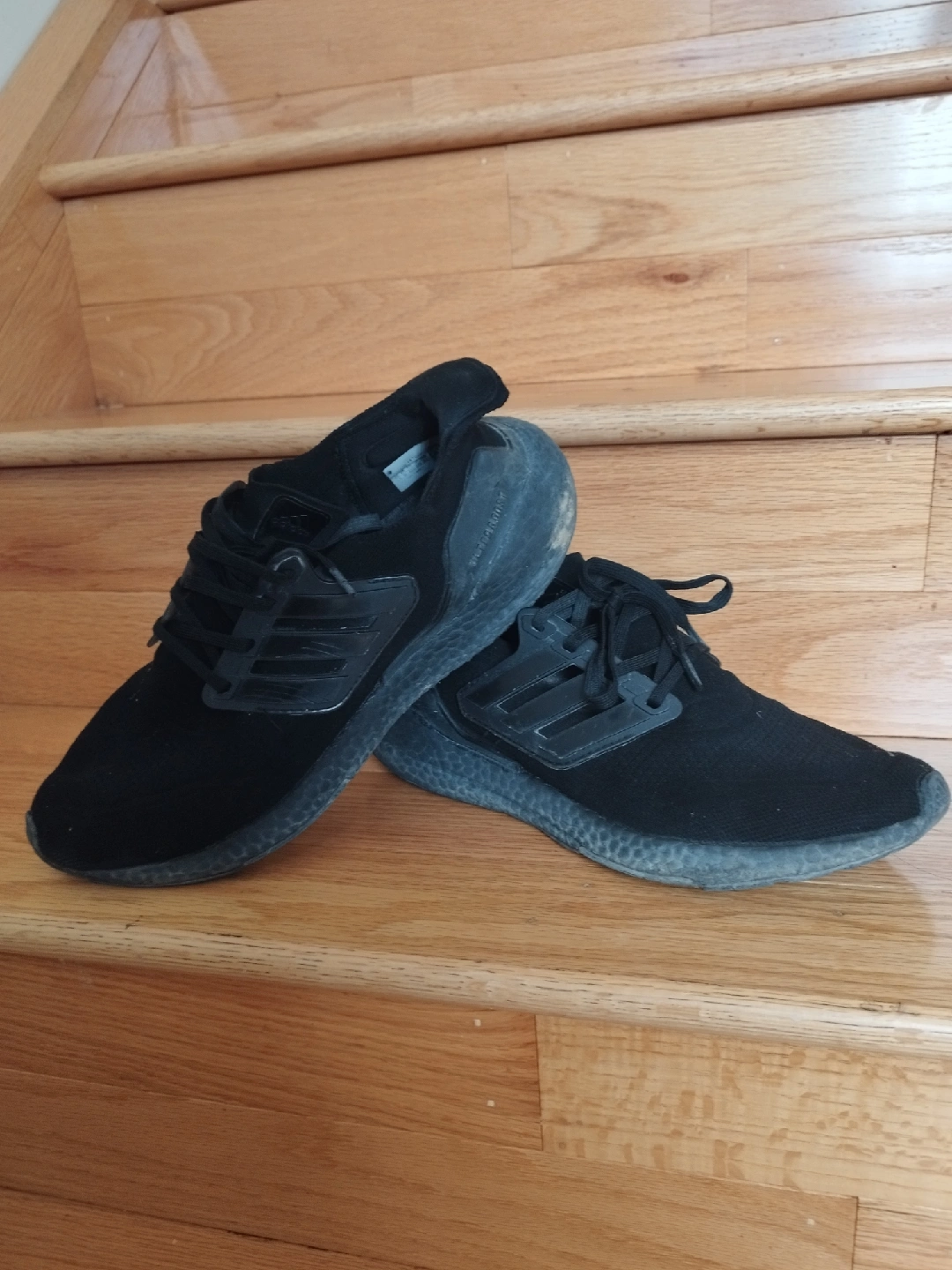 15Selling a pair of Adidas Ultra Boost running shoes in black. They're in used condition, but still have lots of life left for running or casual wear. Great for anyone looking for comfortable and stylish sneakers!