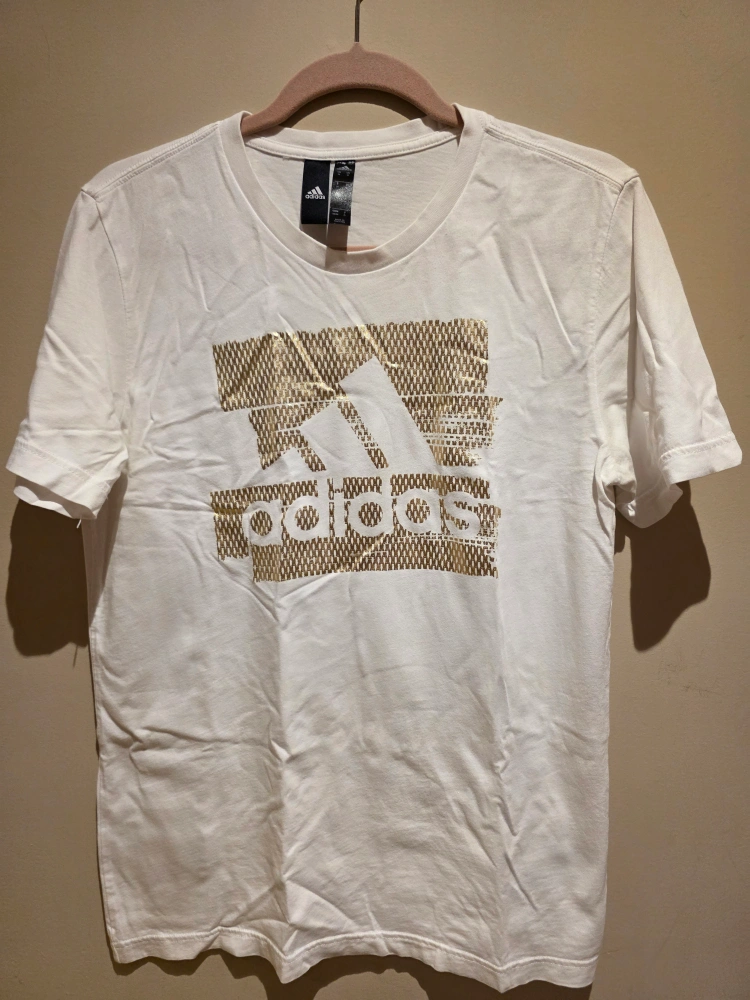 49Selling a white Adidas t-shirt with a gold logo. It's a size medium and in great condition. Perfect for casual wear or workouts!
