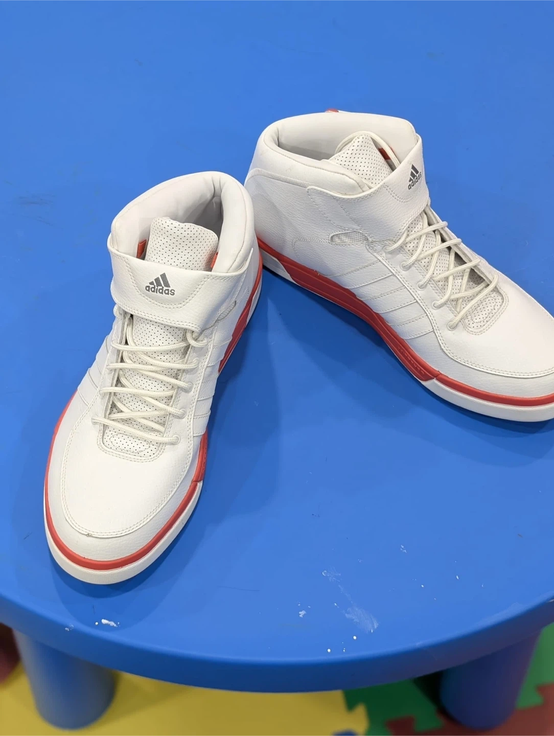 38Adidas high-top sneakers in white with red accents! These are in great shape and ready for a new home. They are a US size 13.