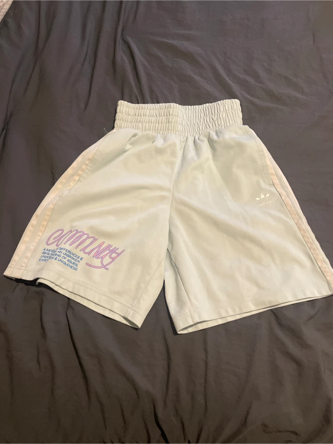 Adidas women's shorts in a light blue colour. They feature the Adidas logo and three stripes on the side. The shorts have an elastic waistband for a comfortable.