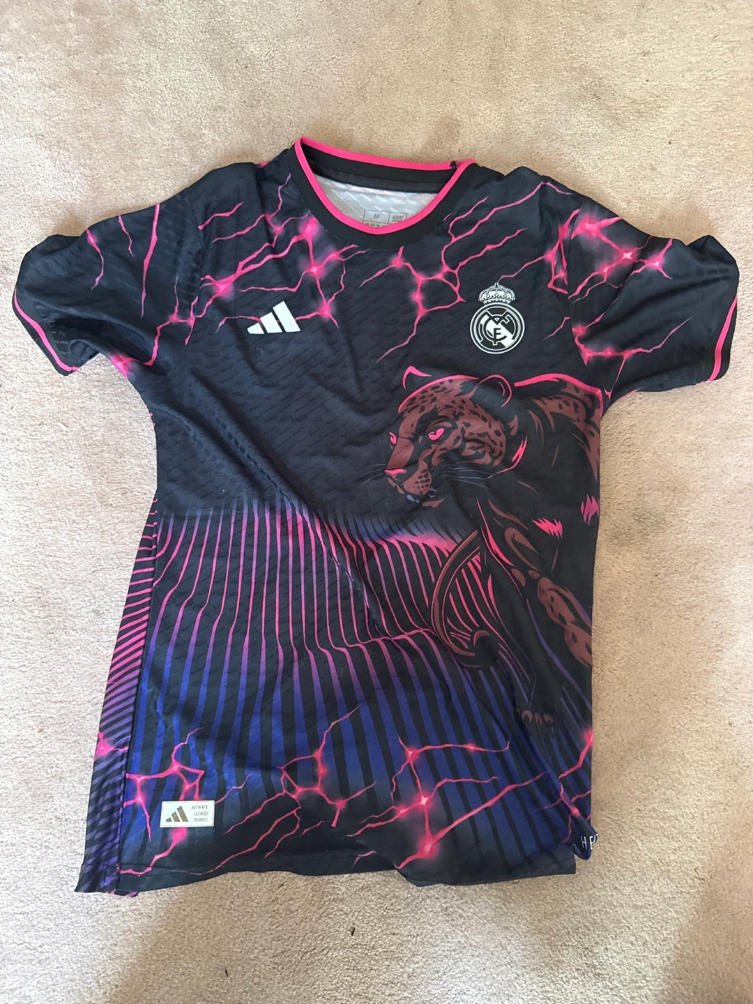 Selling an Adidas x real madrid jersey! It features a unique design with a jaguar. The colours are black, blue, and pink. It's in great condition!