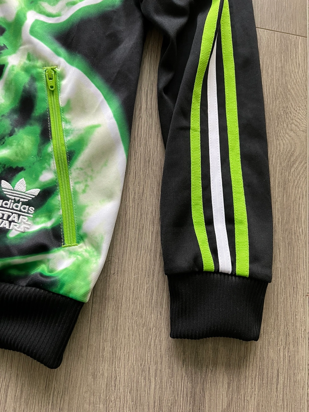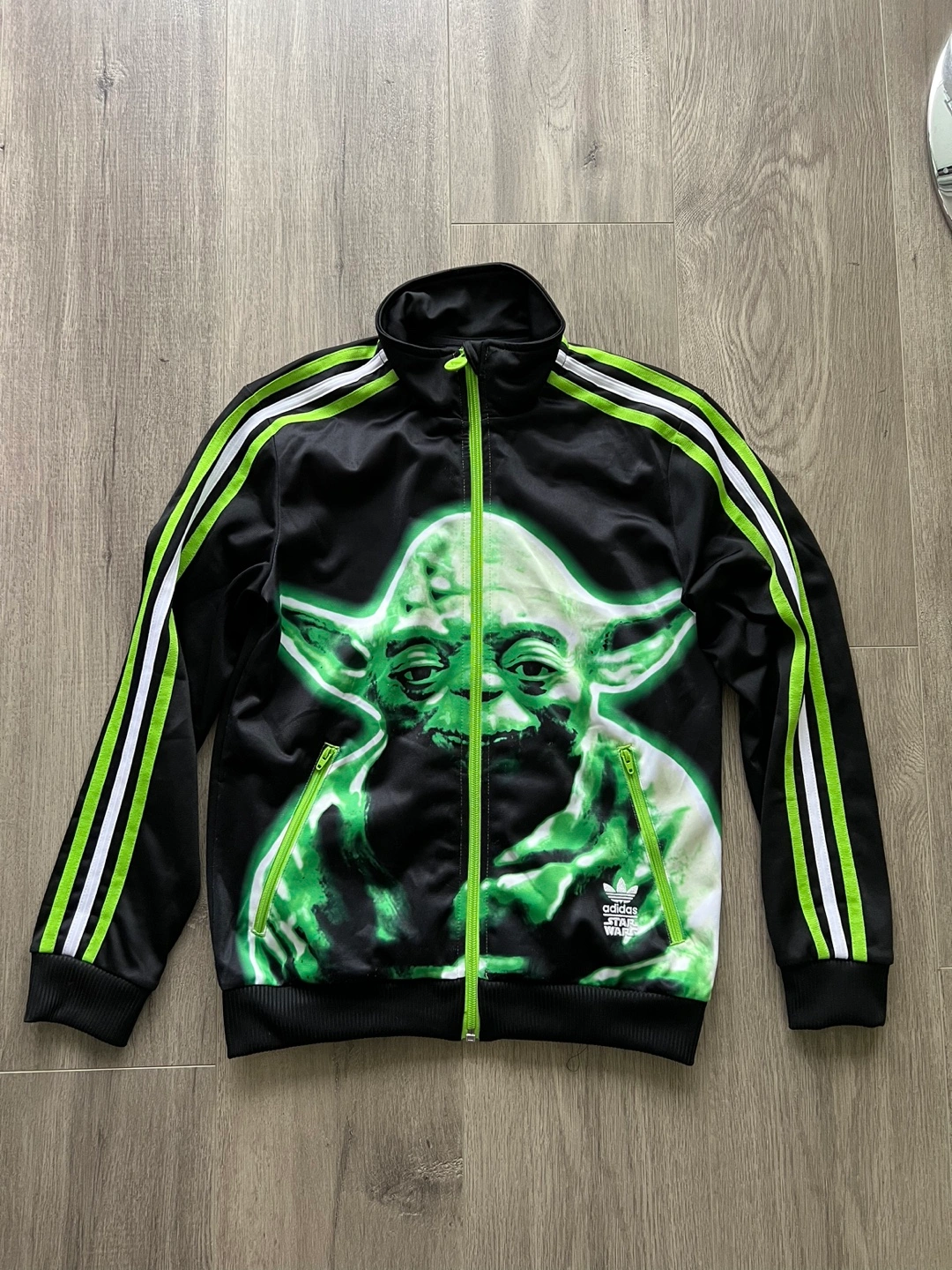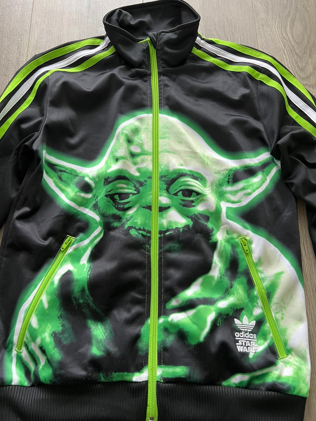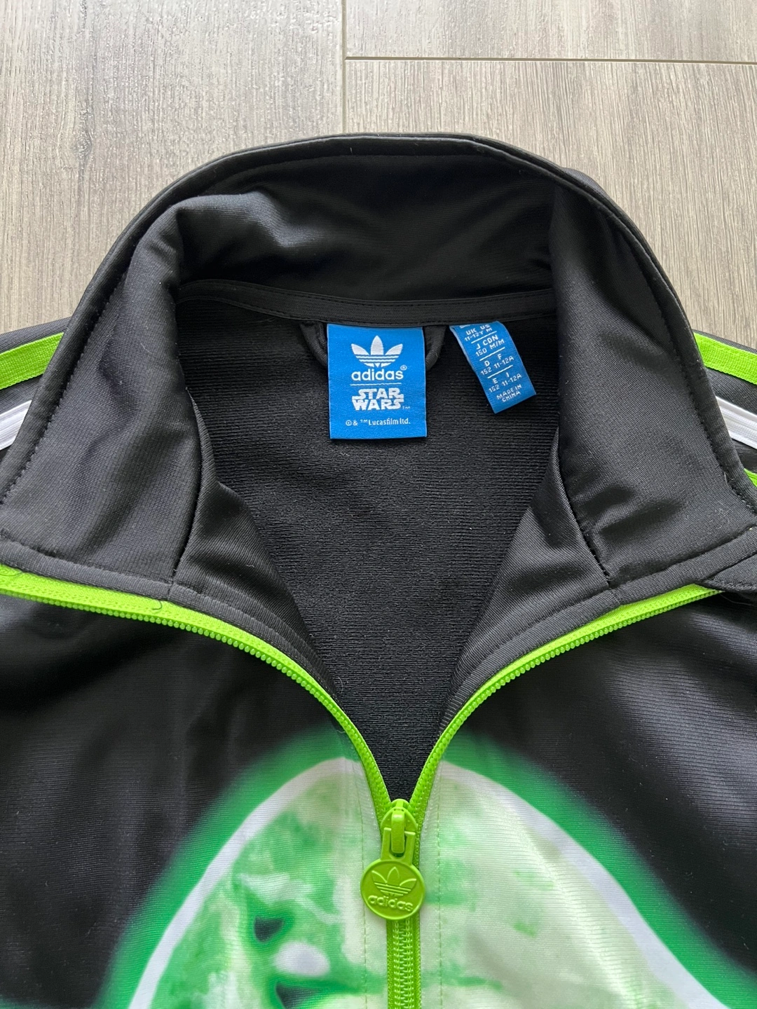 170Black and green track jacket with a Yoda graphic. Limited Star Wars Edition. Features green and white stripes on the sleeves. Zipper closure and two front pockets.