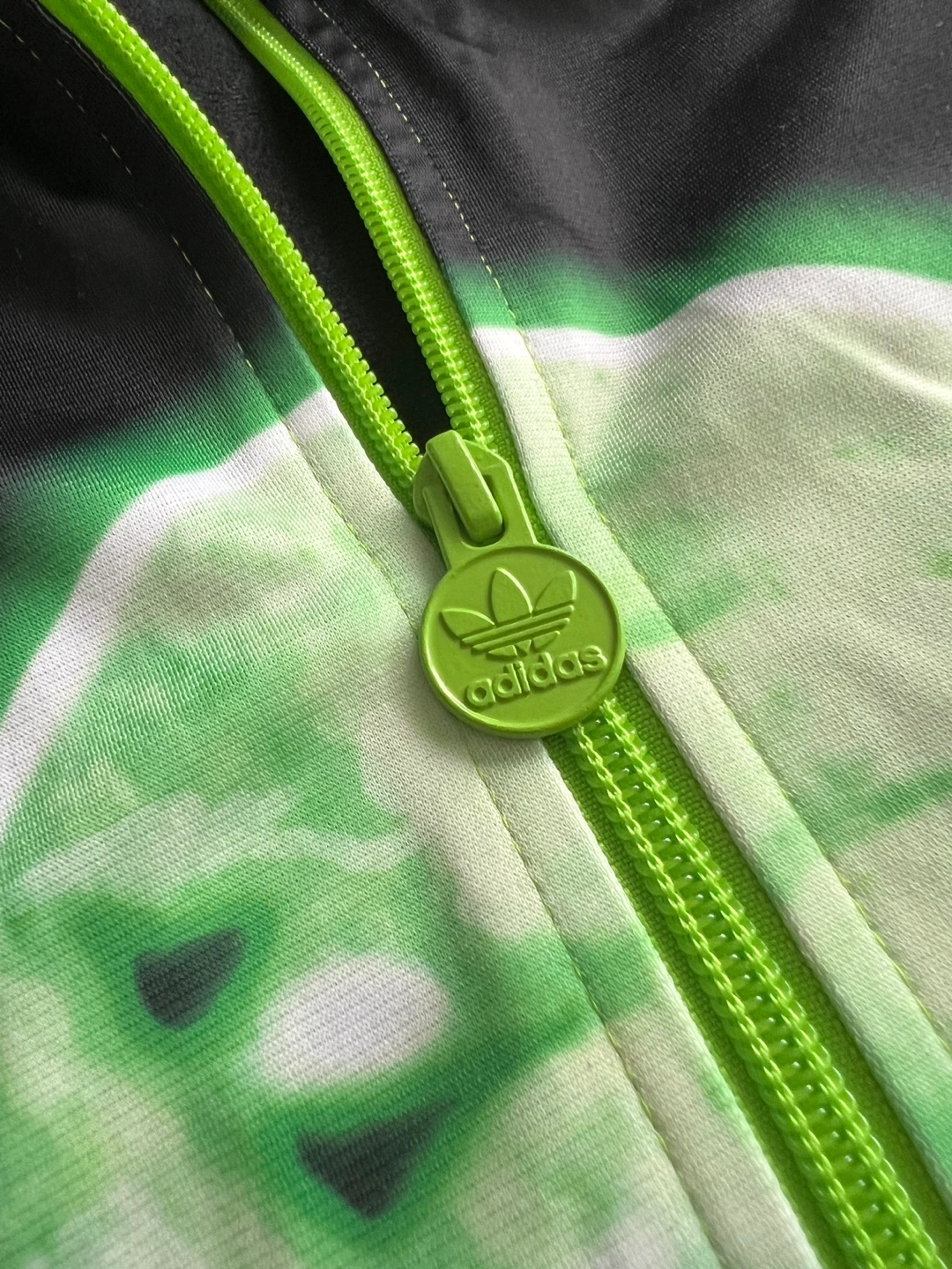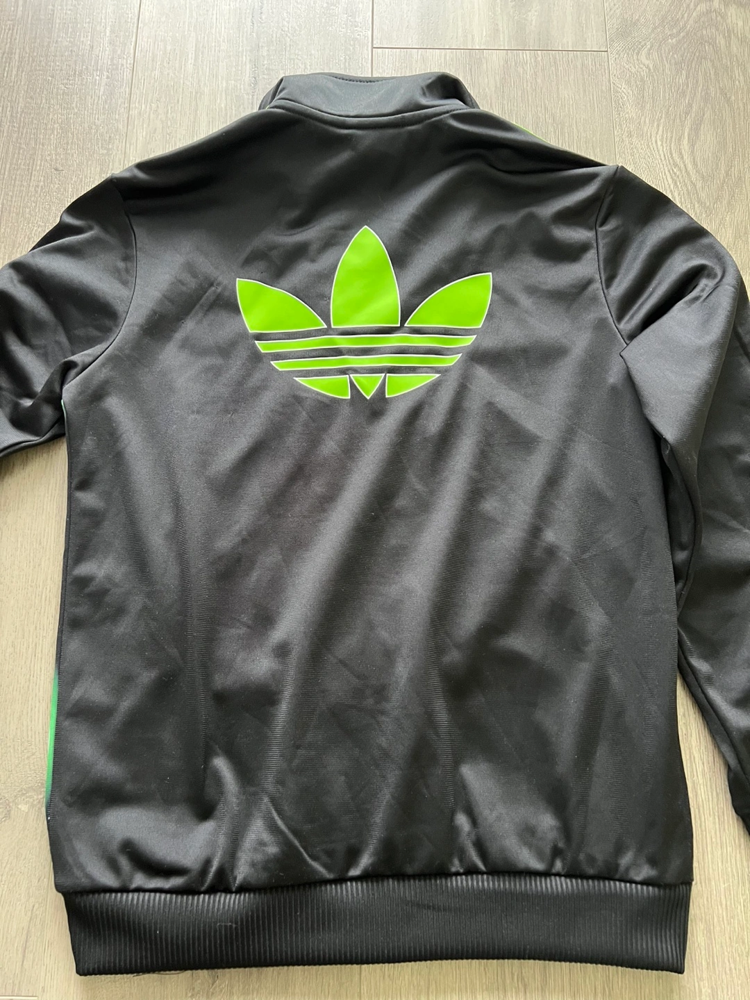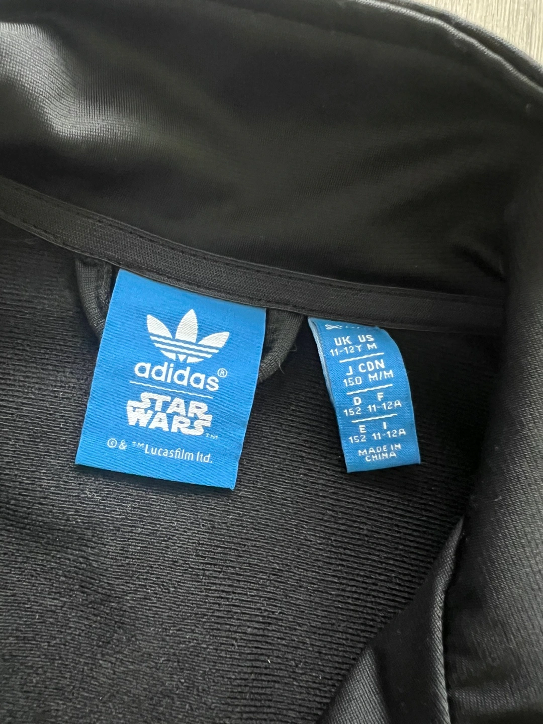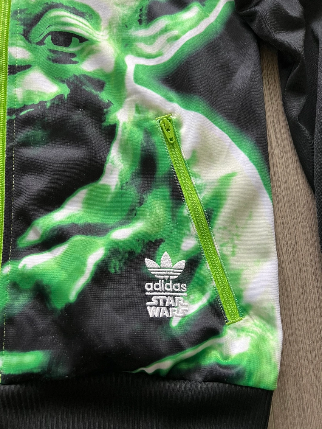 170Black and green track jacket with a Yoda graphic. Limited Star Wars Edition. Features green and white stripes on the sleeves. Zipper closure and two front pockets.