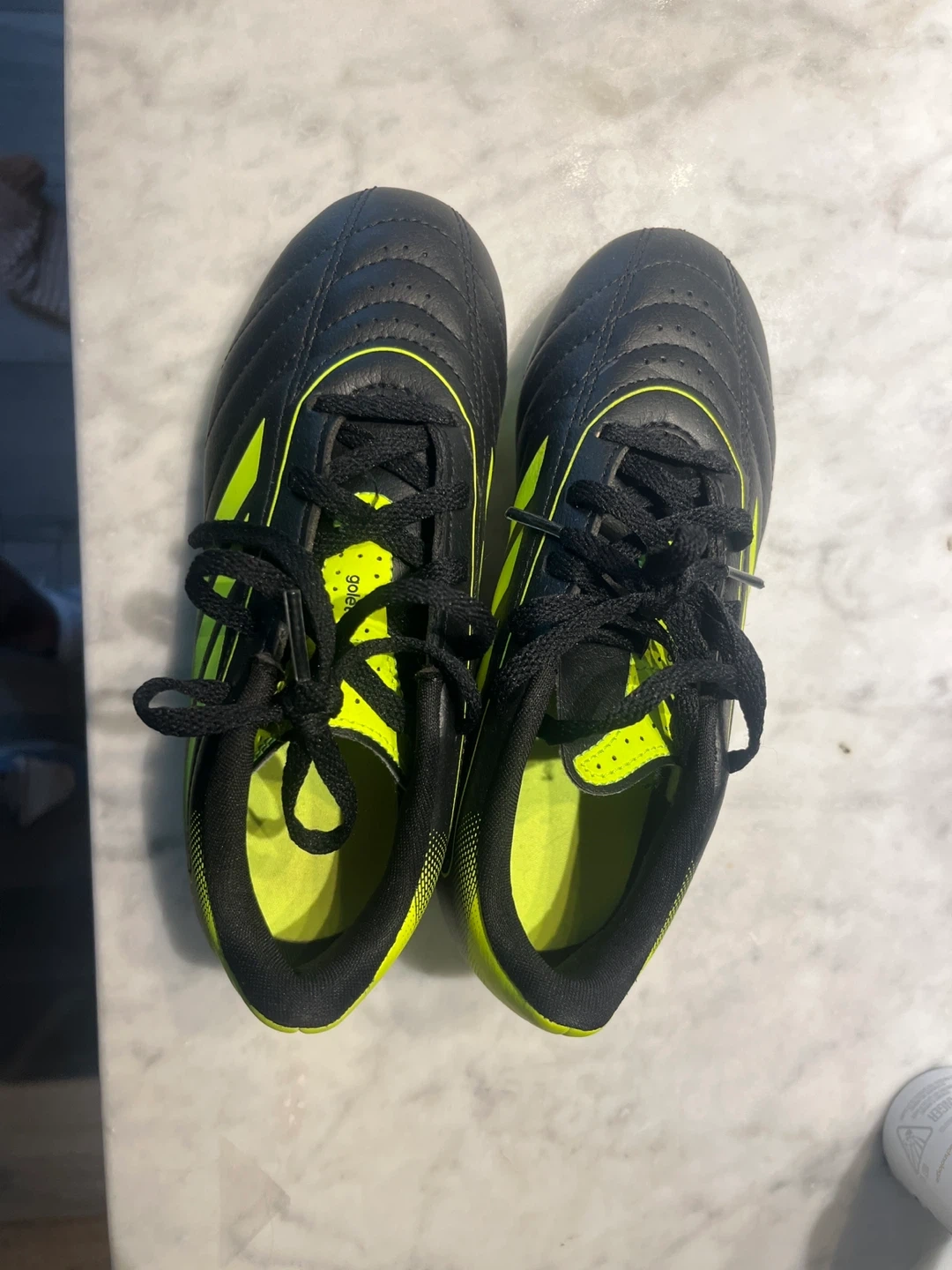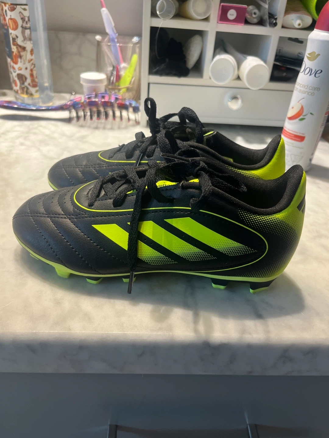 Selling a pair of Adidas youth soccer cleats in black with neon green accents. They are in good condition and ready for the field! Perfect for your young soccer player. Size US1
