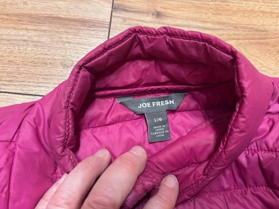 Only worn a handful of times. This Joe Fresh light puffy jacket is a size large. It packs very small into an attached bag. Pick up is available near 120th and 64th in Surrey or near the hospital in Richmond.