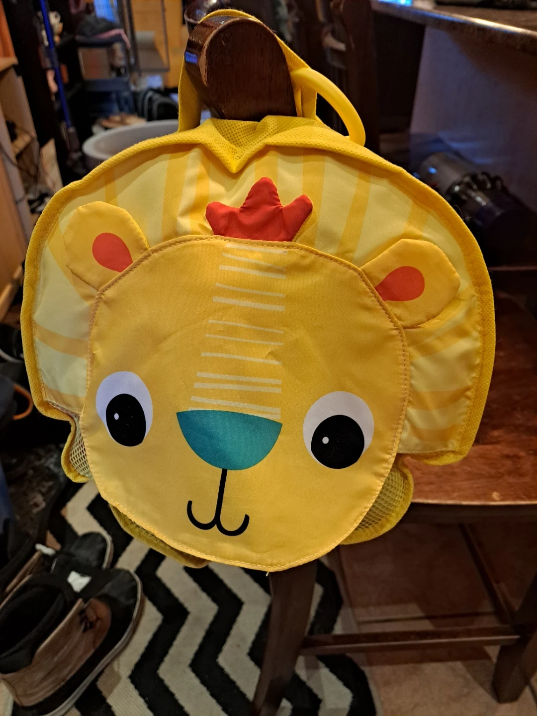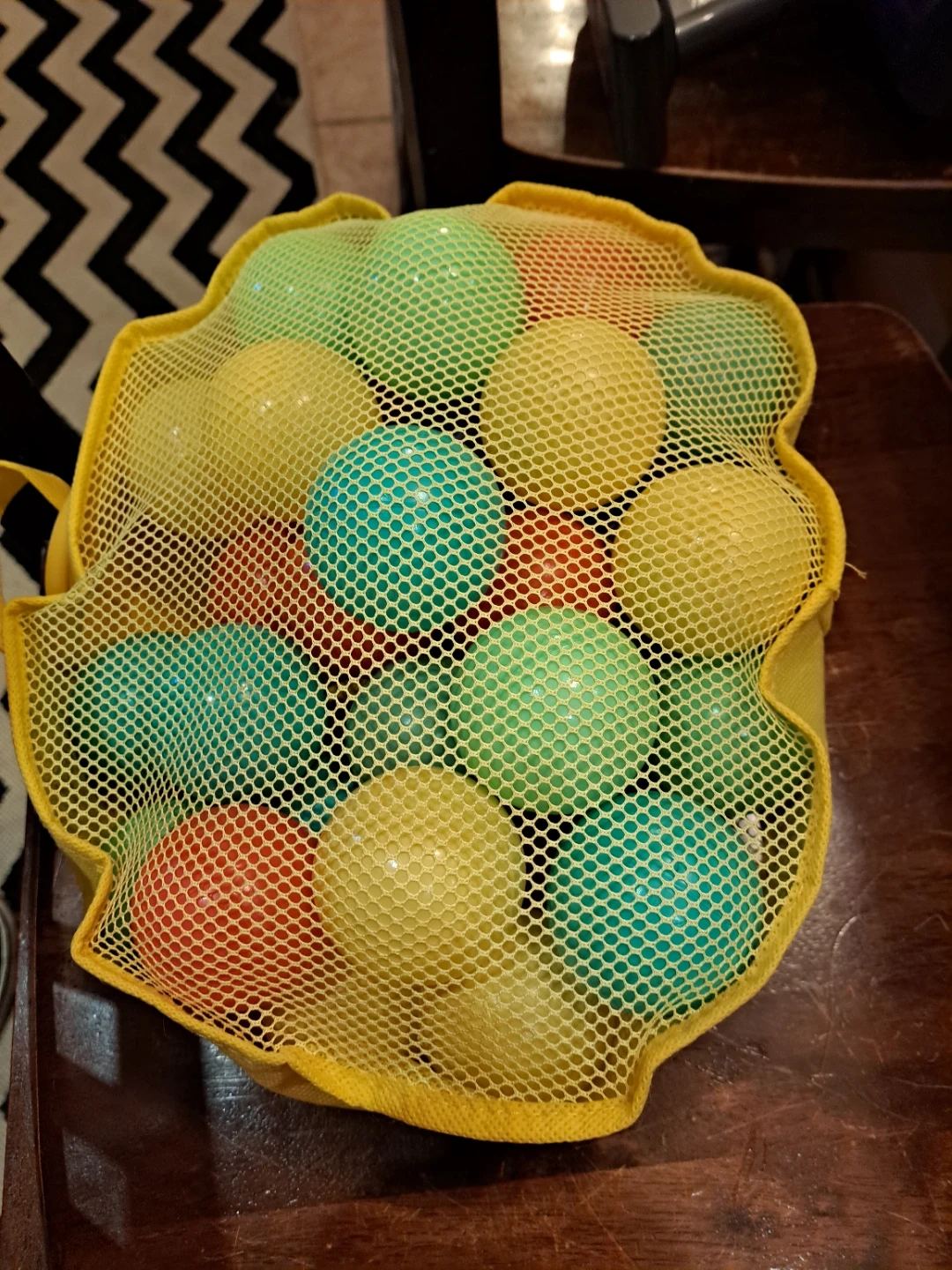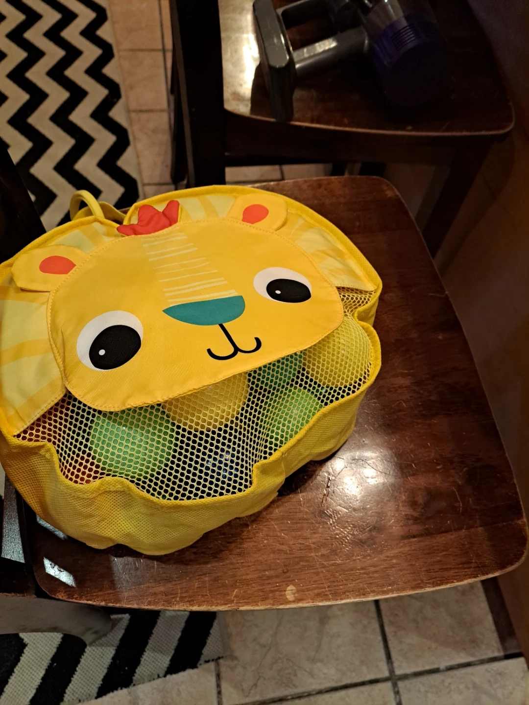 This fun mesh toy bag is shaped like a friendly lion. It's perfect for storing small toys or balls. It includes a variety of colourful play balls inside.