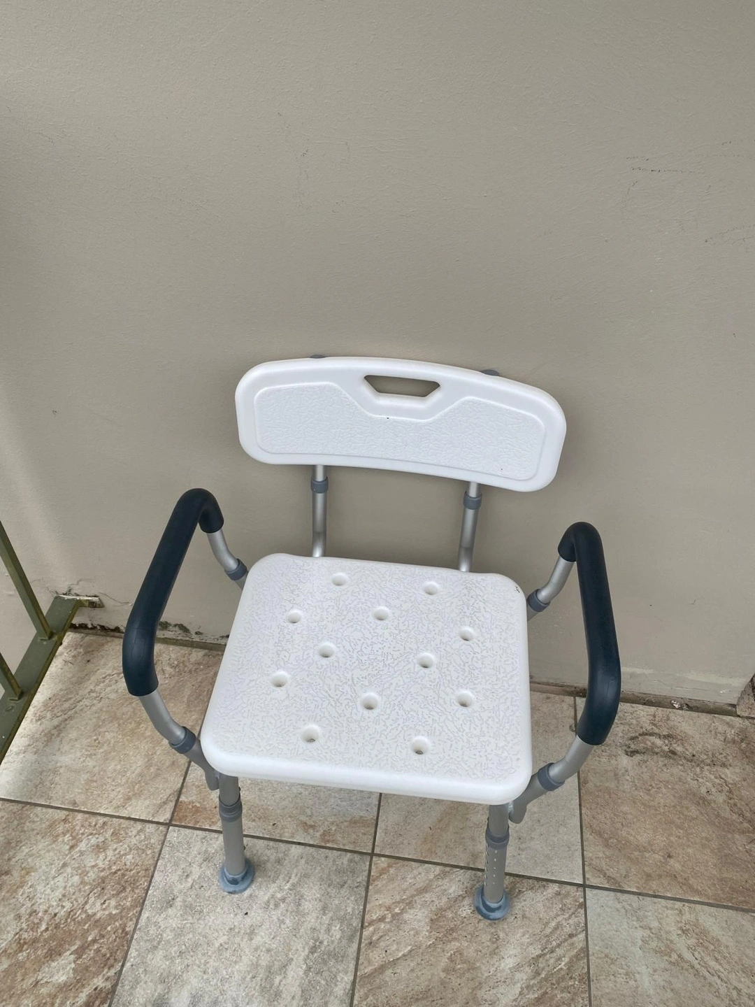 This adjustable bath and shower chair provides a safe and comfortable seating option. It features a sturdy frame, a non-slip seat with drainage holes, and comfortable armrests for added support. The height is adjustable to suit individual needs, making it a practical addition to any bathroom