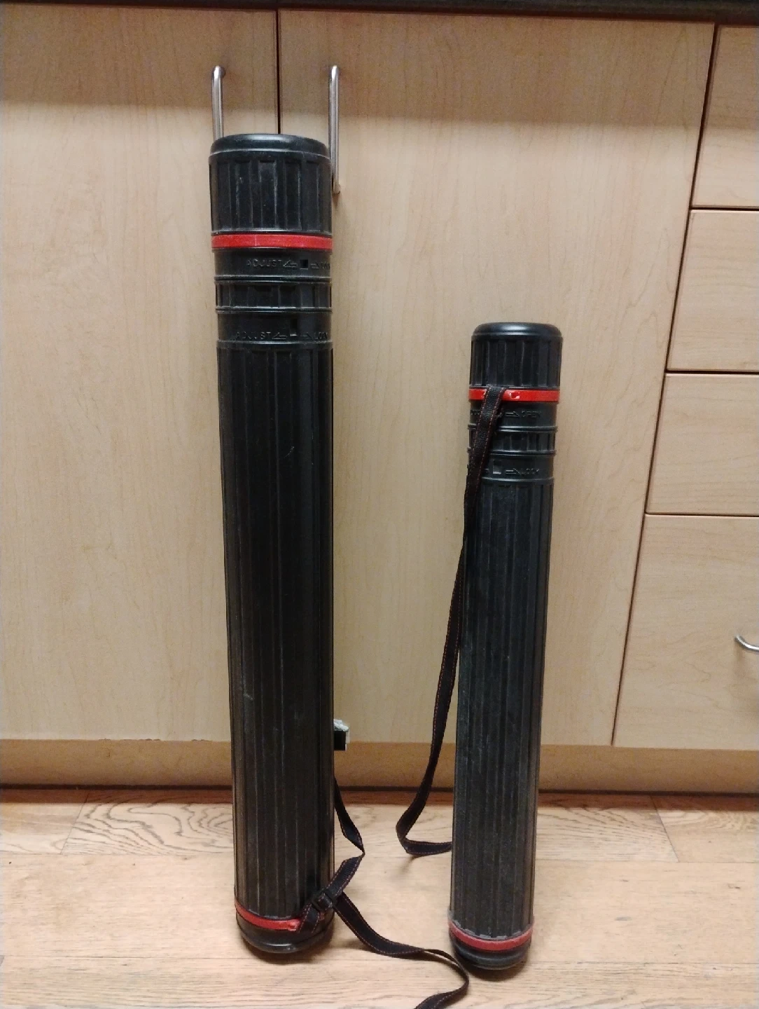 82Two adjustable black plastic drawing tubes. They're great for storing and transporting your artwork or blueprints. One is 30 inch, and the other is 25 inch. Perfect for students or professionals!