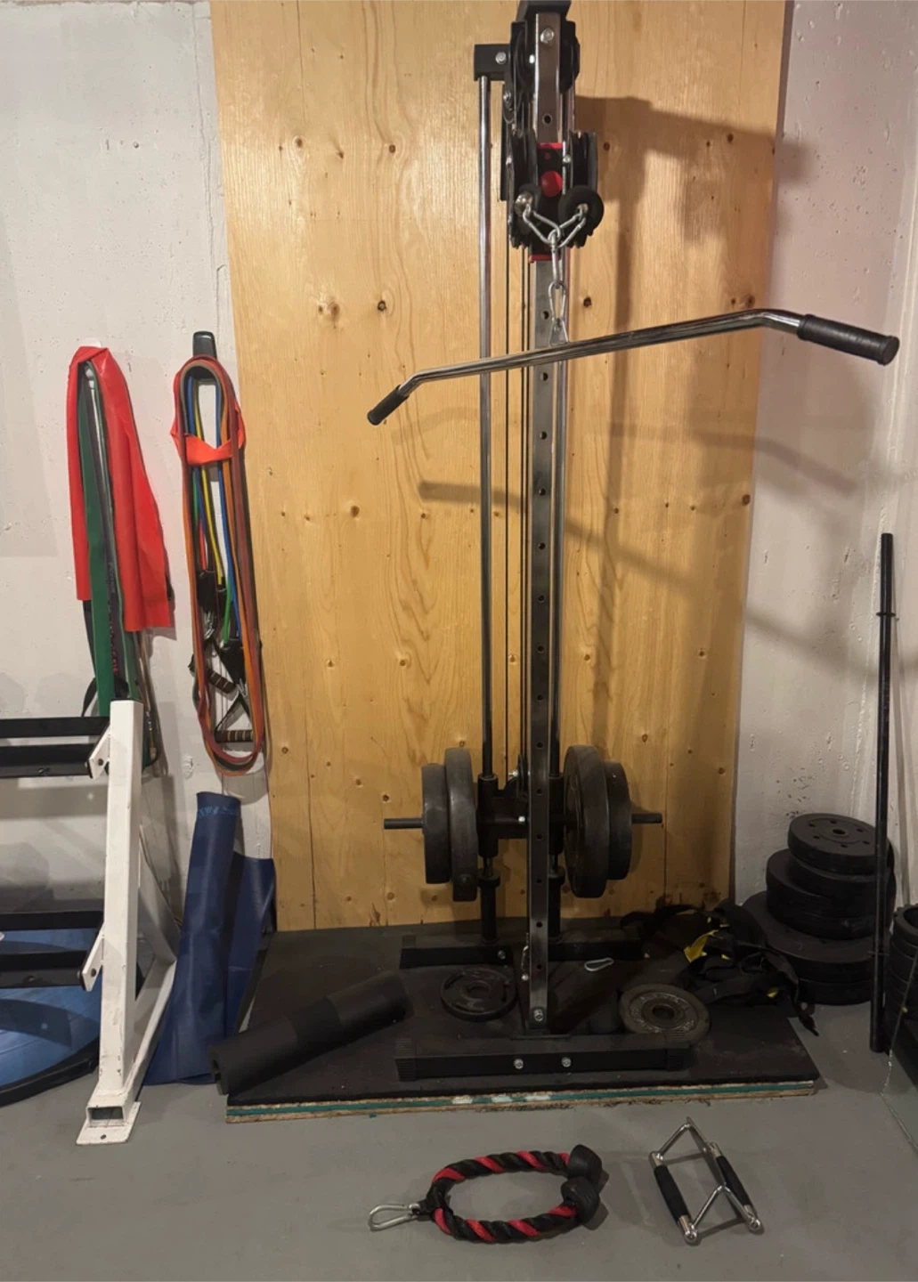 Adjustable cable machine, come with three handle attachements. It is plate loaded and comes with 180lbs in weight. It's in good condition and ready for a new home gym