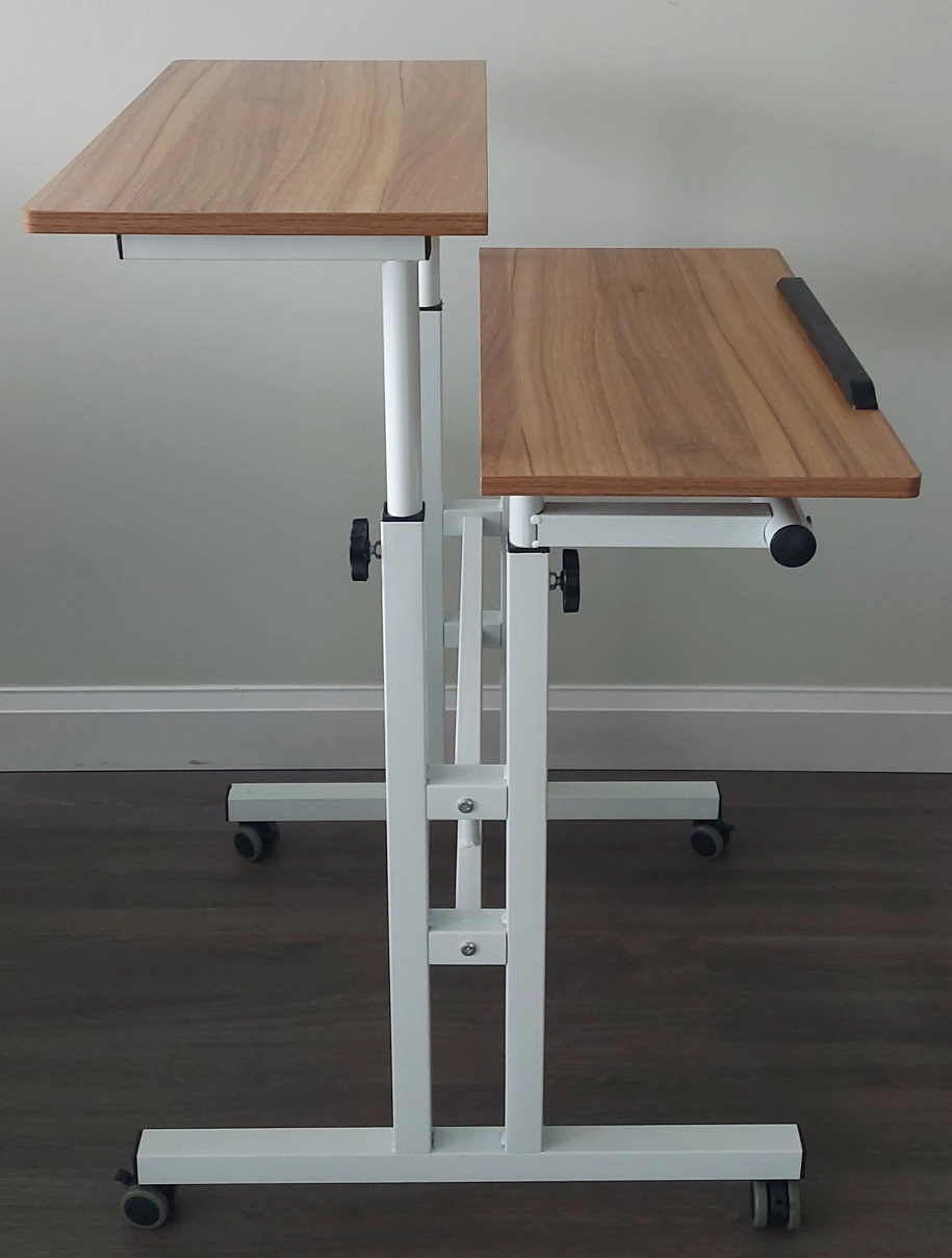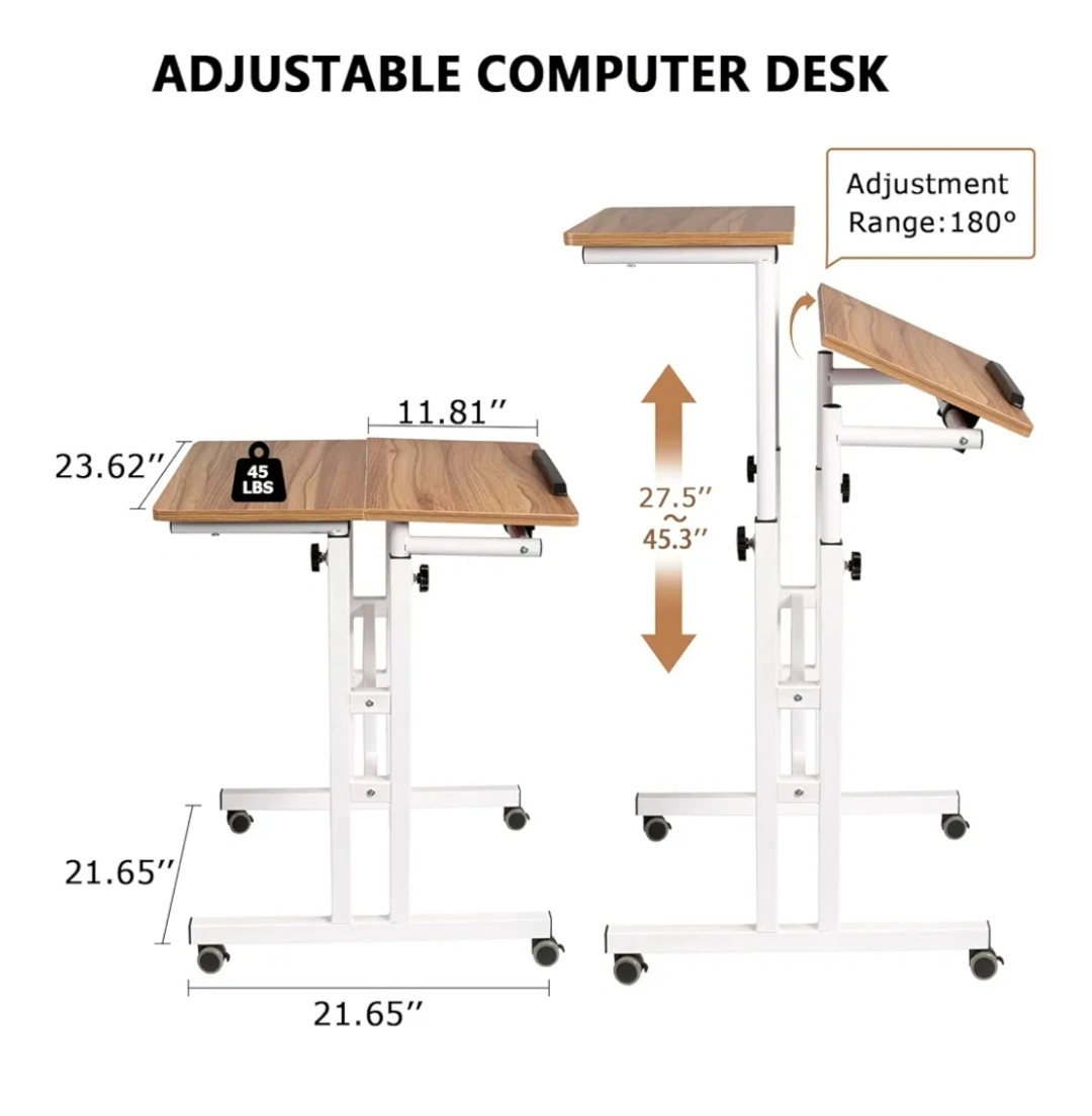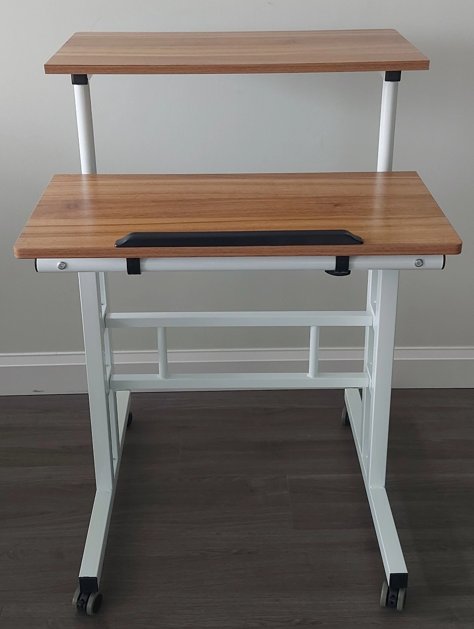 Selling an adjustable computer desk that's super handy for working from home or any space where you need a flexible setup! It features two tiers and rolls around easily thanks to the wheels. The height is adjustable, and the top tier can tilt for added comfort. Perfect for small spaces! Used by 1 person only. There are no damages.
