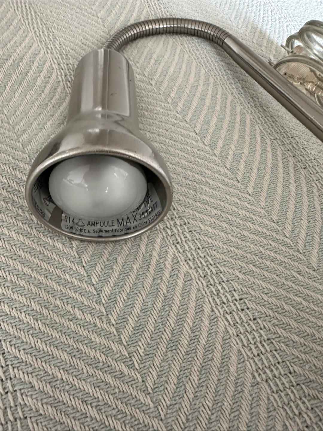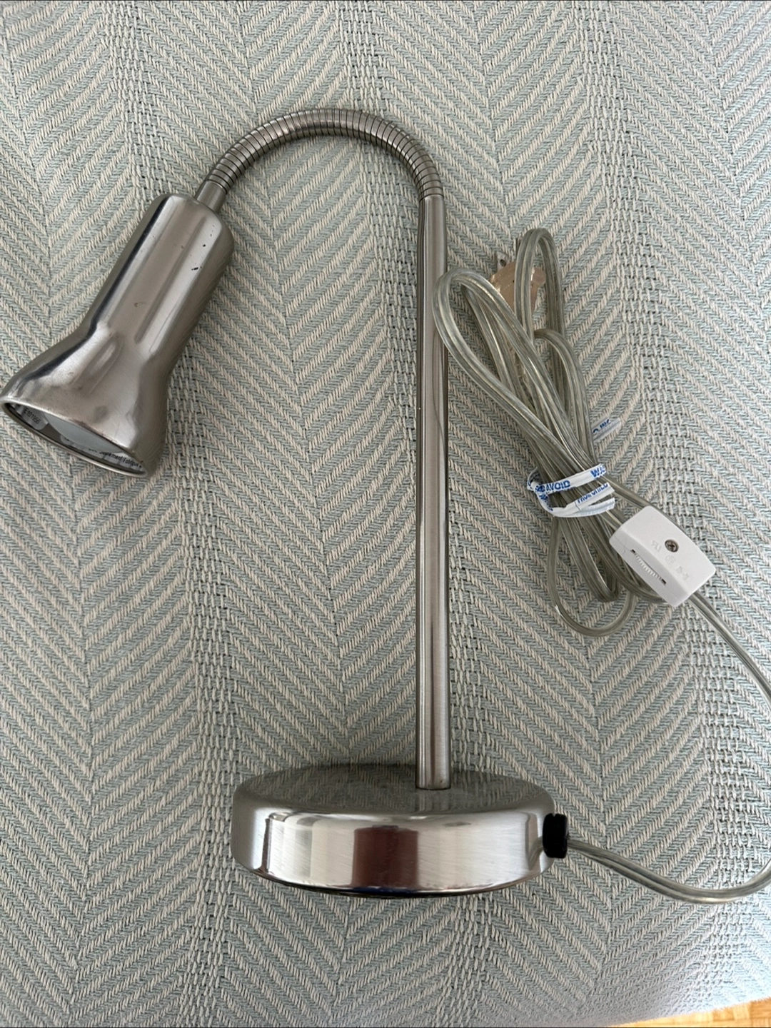 A desk lamp with a flexible neck, featuring a metal finish. The base is circular. Perfect for those late-night reading sessions.