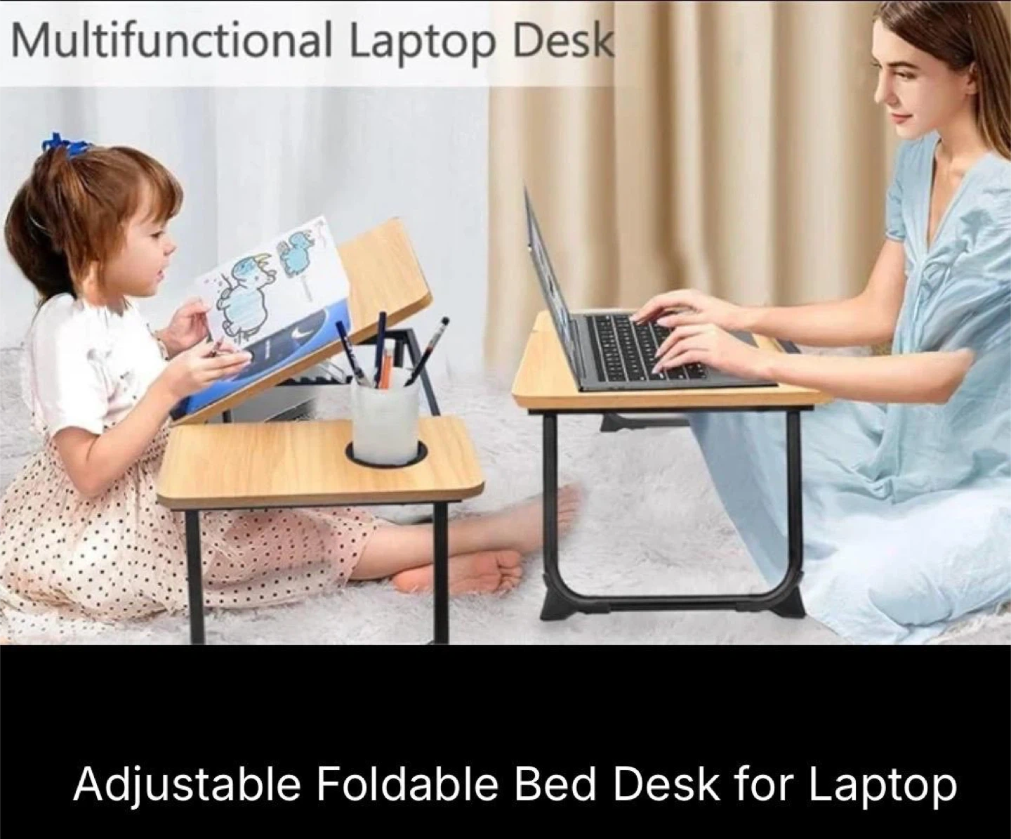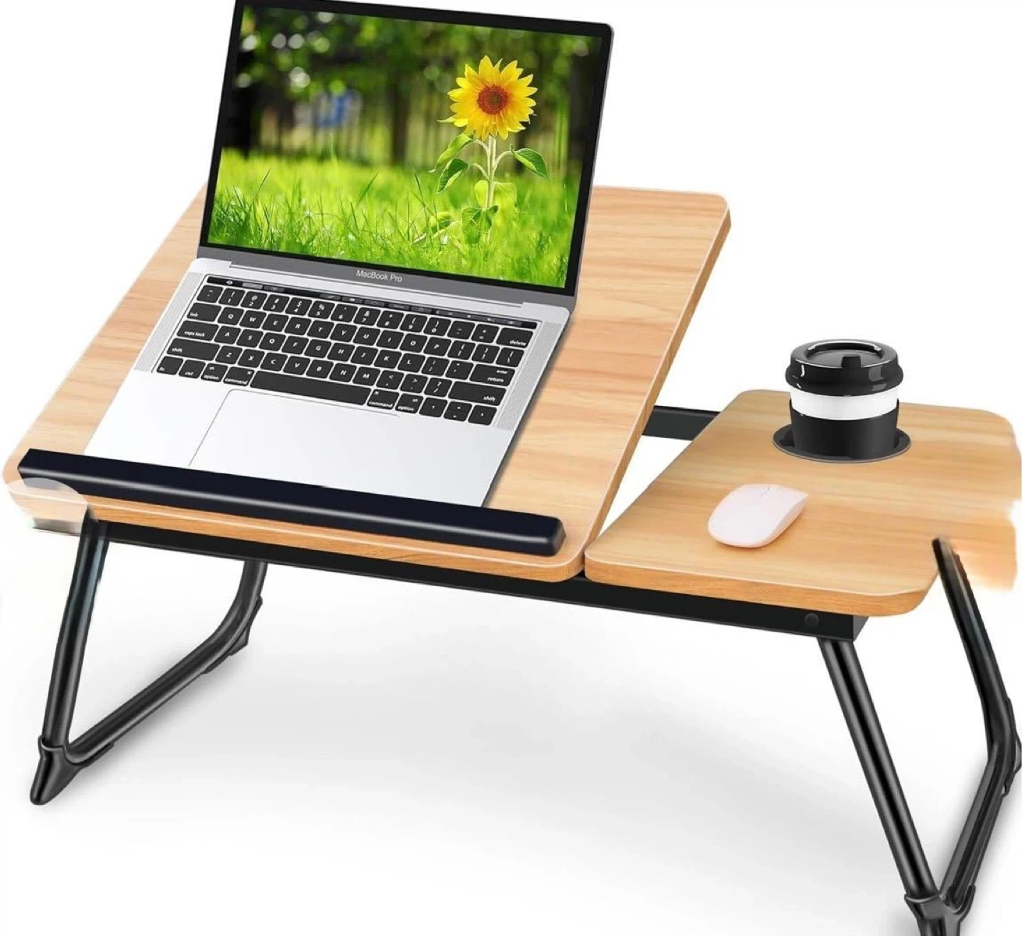 This adjustable and foldable bed desk is perfect for using your laptop comfortably in bed or on the couch! It features a convenient design that makes it easy to set up and store. The desk also has a built-in cup holder and a slot for your tablet or phone, making it a versatile workstation