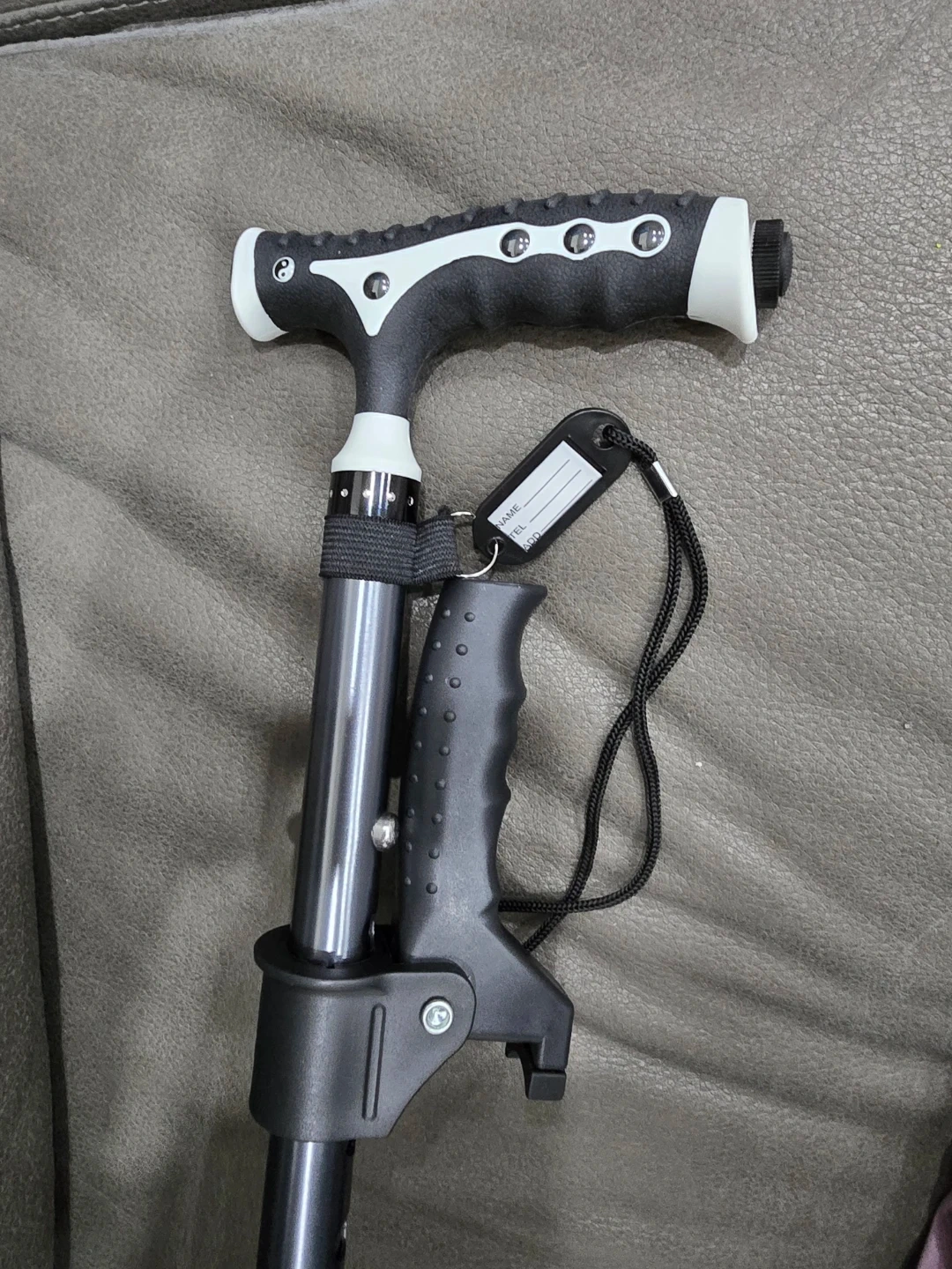 16This adjustable folding walking stick cane is perfect for anyone needing a little extra support. It's lightweight and portable, making it easy to take with you wherever you go. It requires 2 AA batteries.