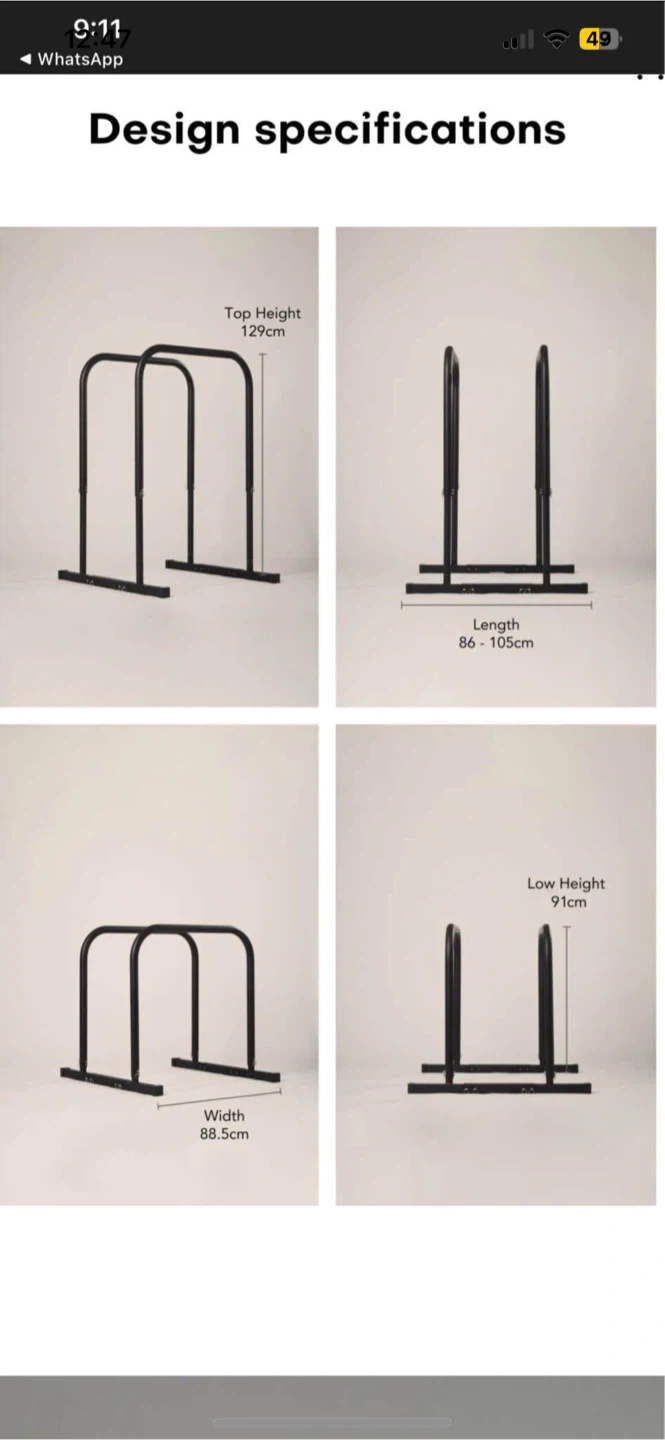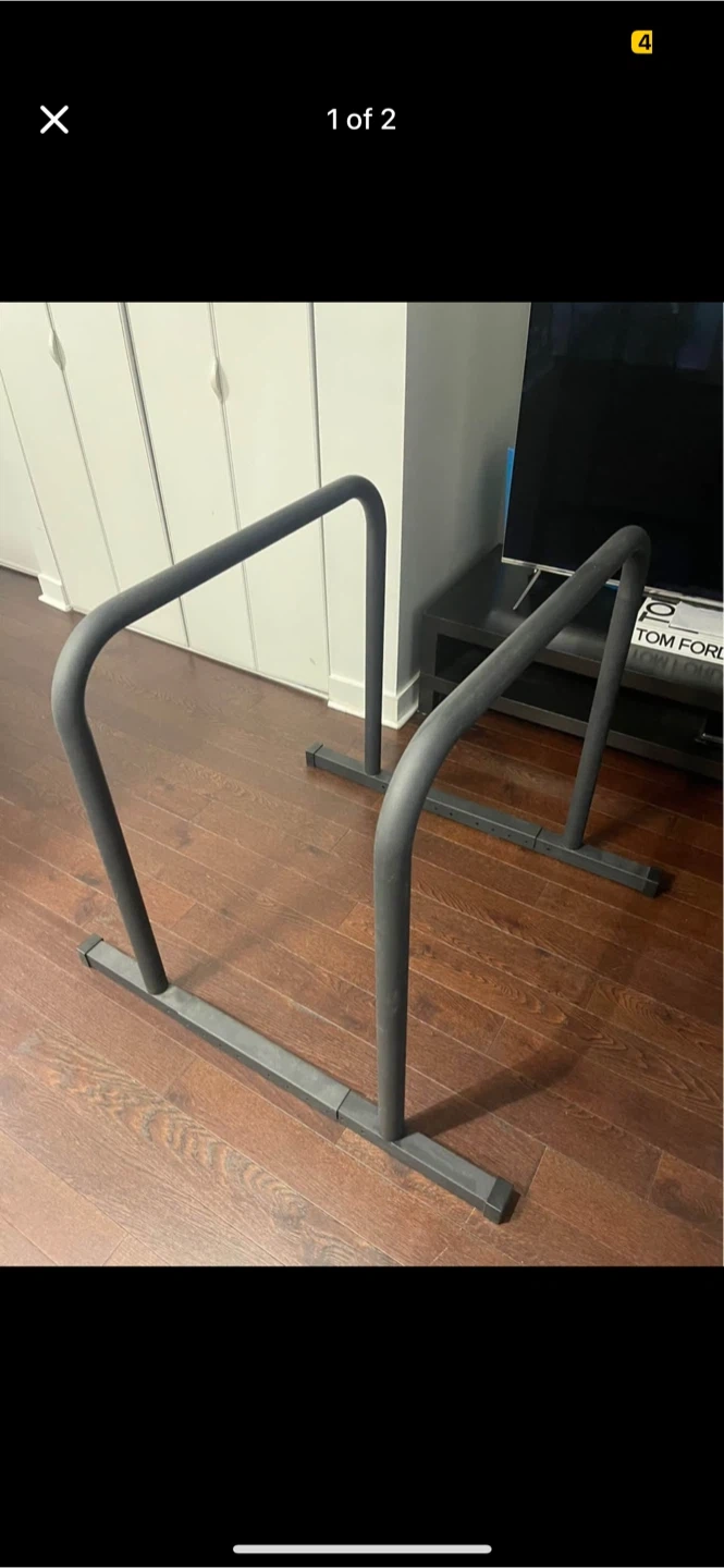 10These parallettes bars are in great shape and ready for a new home! The height is adjustable, ranging from 91cm to 129cm. The length is between 86cm and 105cm, and the width is 88.5cm. Perfect for your home gym!