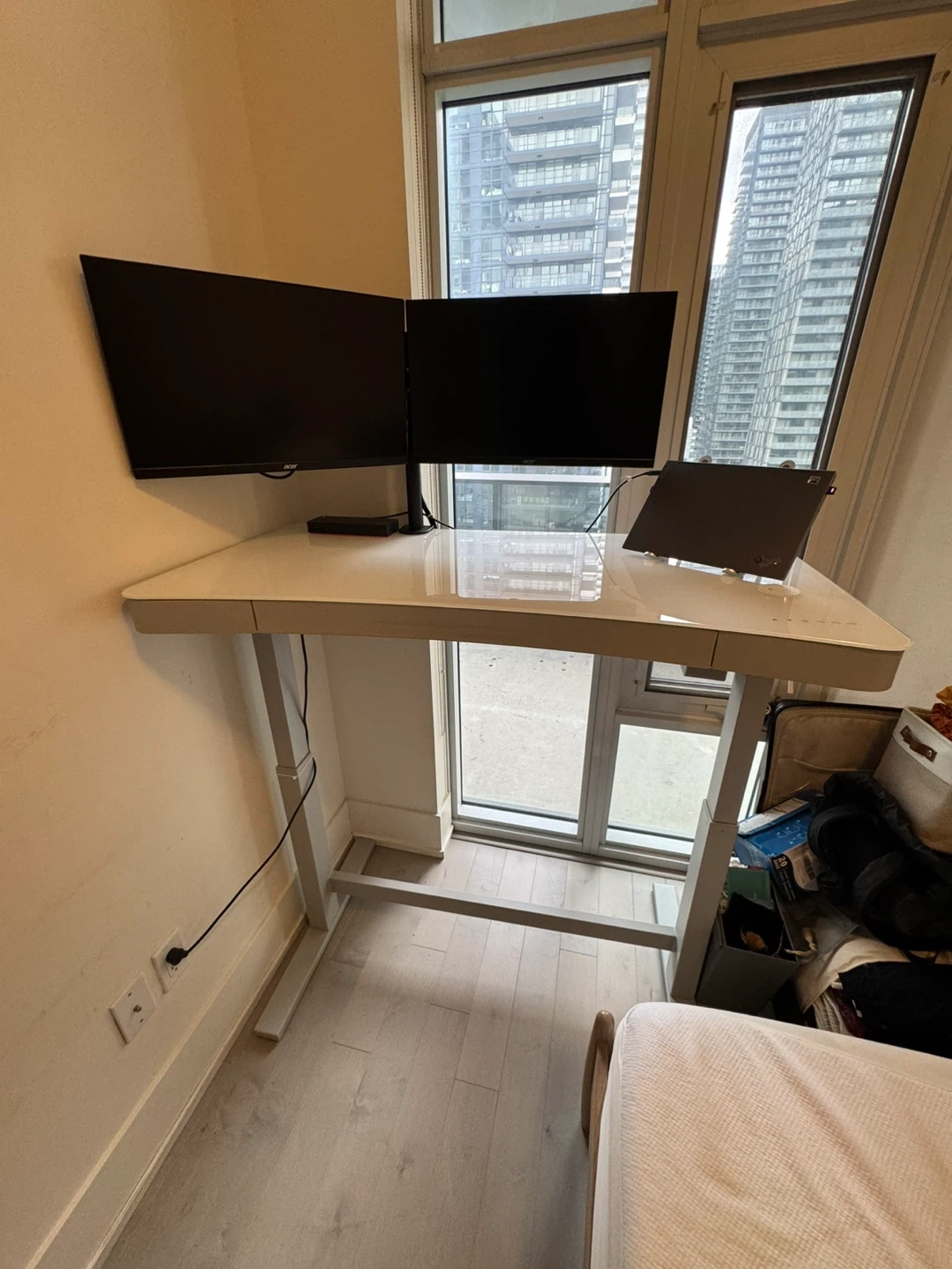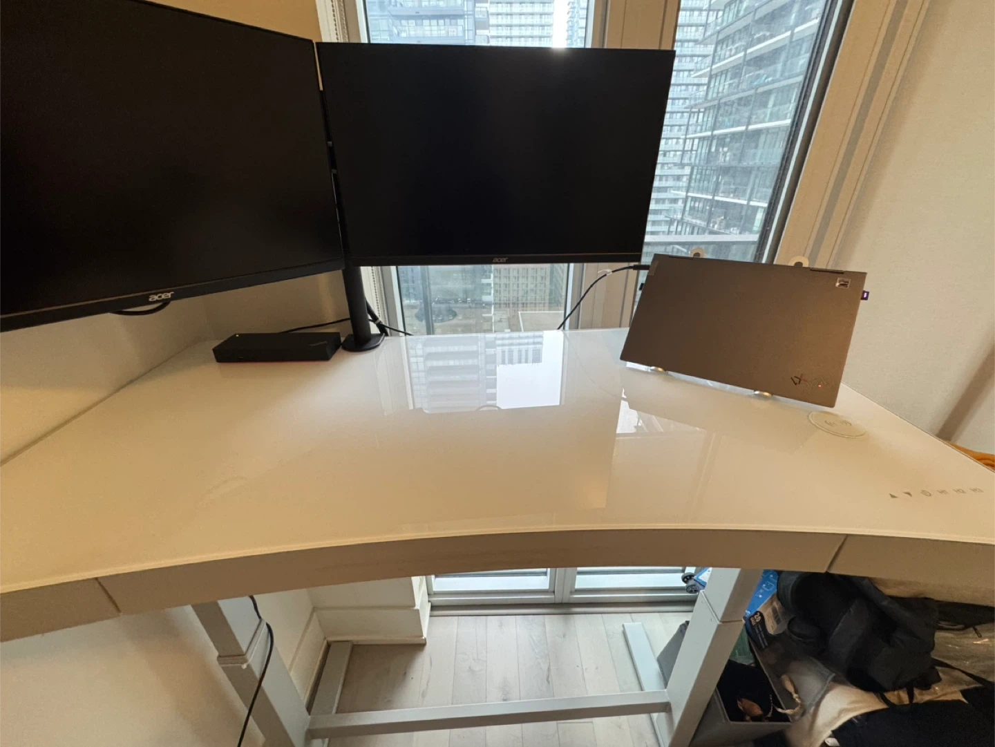 27747.5”length x 21.5” in middle and 24” on the side weight x height adjustable - this is glass top with 2 scratches and USB port and built in wireless charger with a drawer Selling a height-adjustable standing desk. It's in great shape and perfect for working from home! It has a white surface and an adjustable frame. There are buttons on the surface to adjust the height, and a wireless charging pad built in