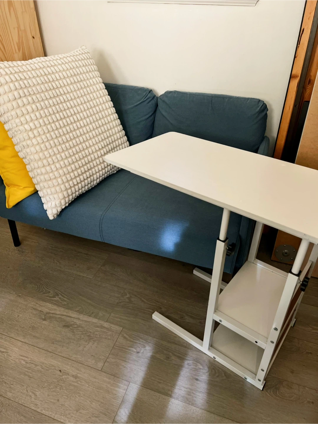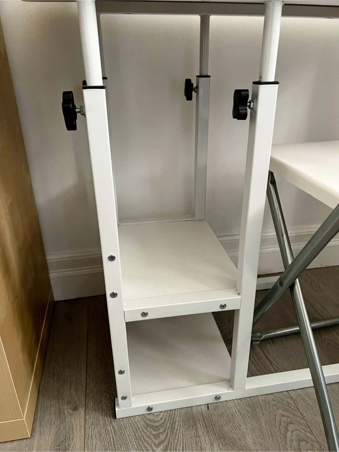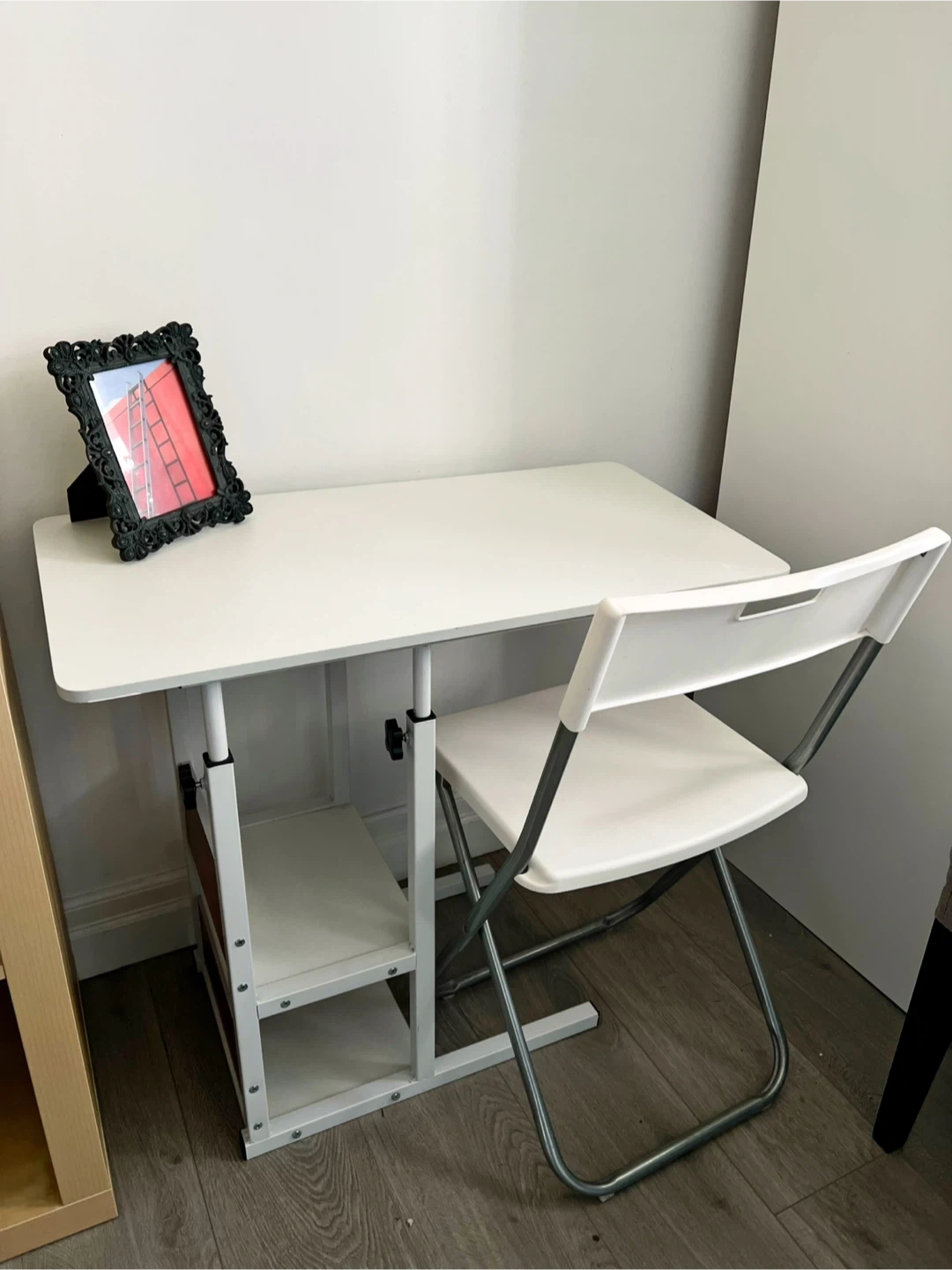 81Looking to sell this handy adjustable desk and free folding chair. It's perfect for small spaces. The desk has a convenient shelf underneath for extra storage. The set is in great condition! Small fee for delivery if nearby.
