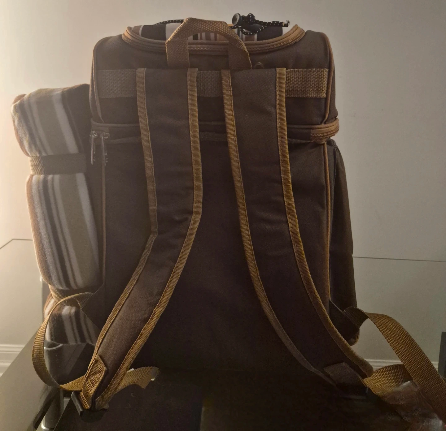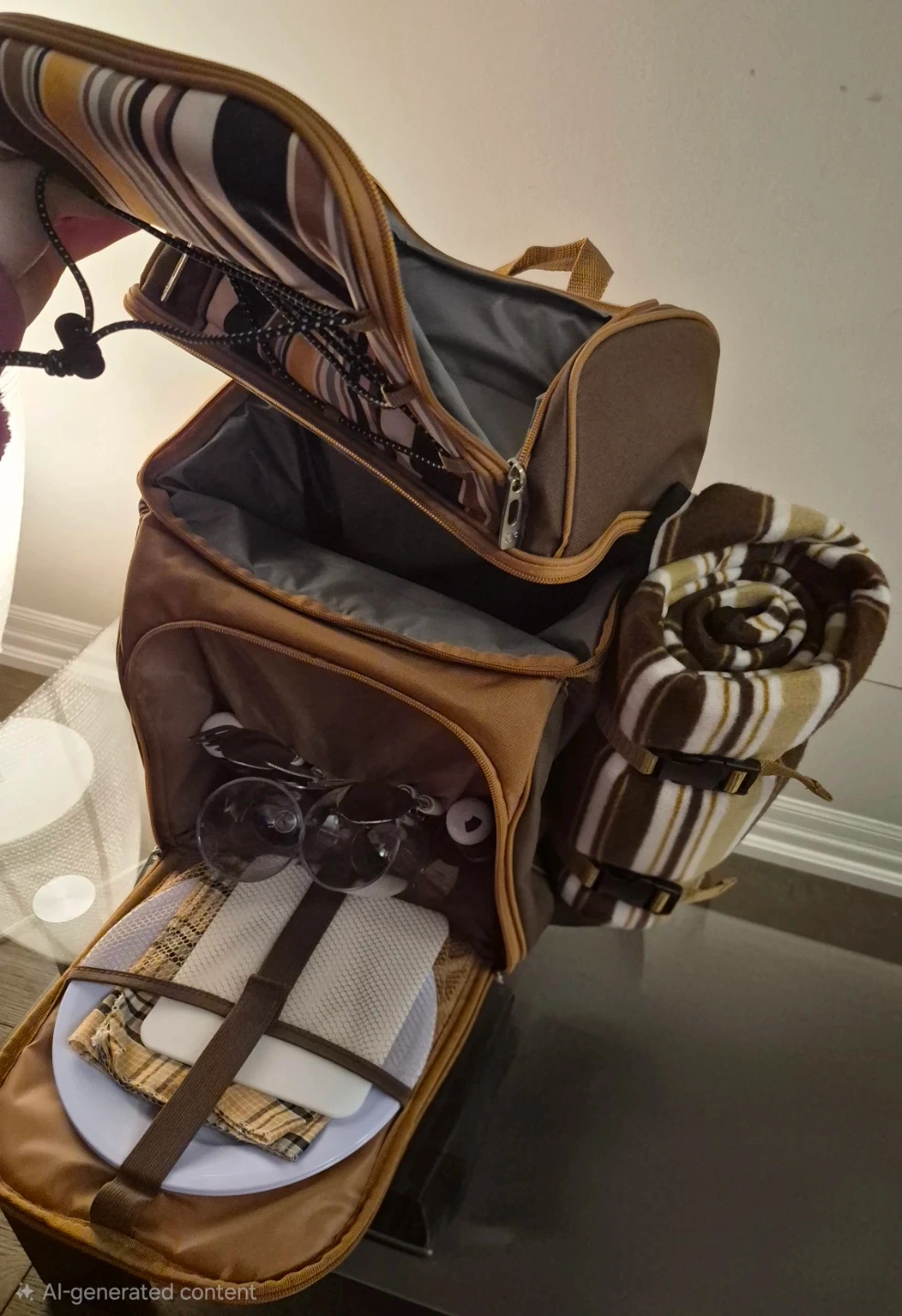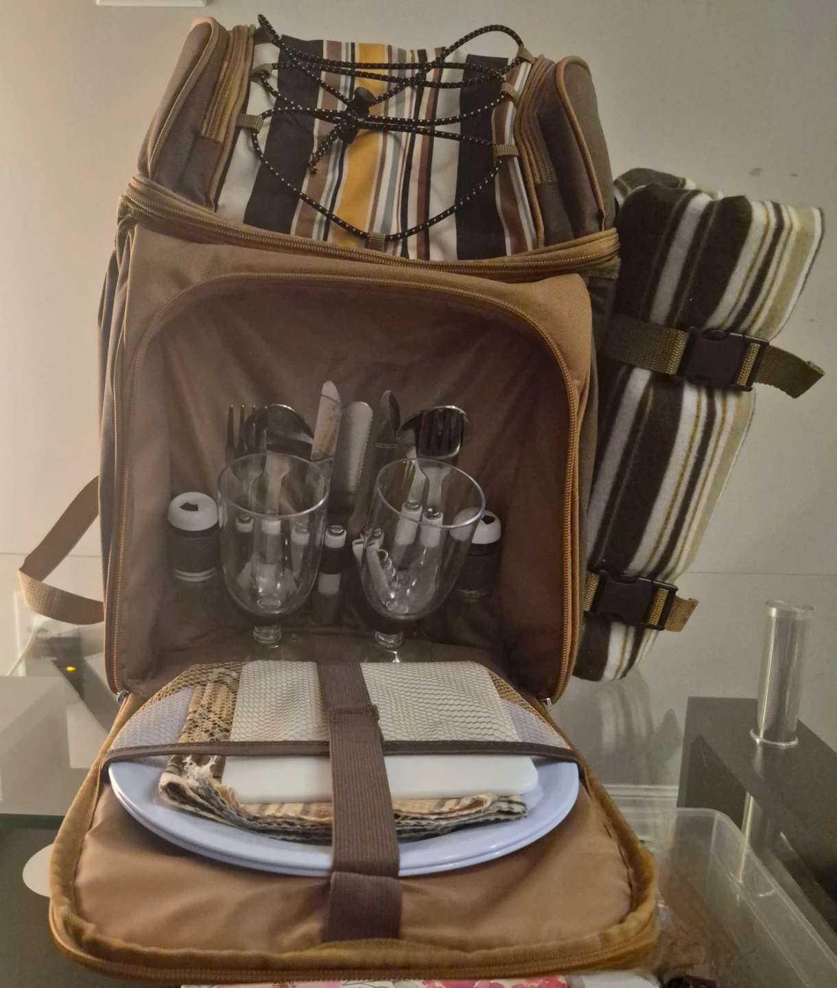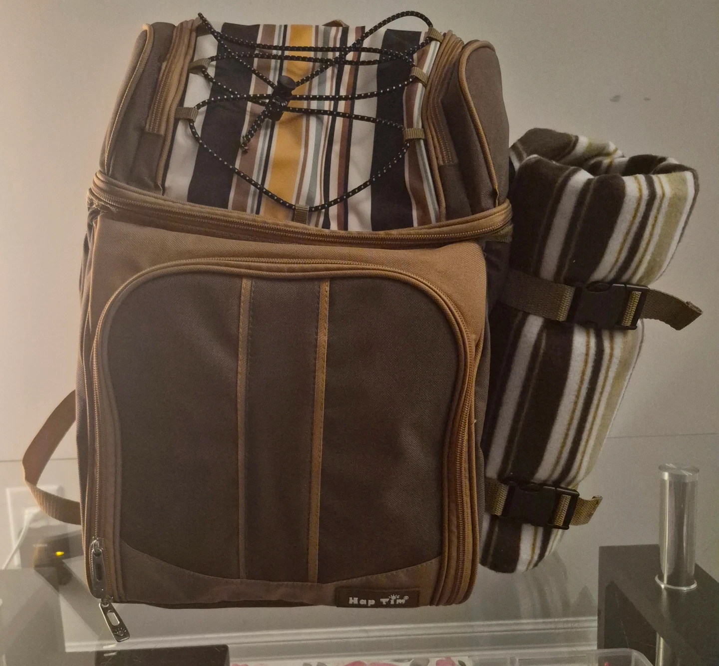 This Hap Tim picnic backpack has never been use. Is brown with striped accents. It includes a blanket, plates, cutlery, and glasses. It's perfect for outdoor adventures!