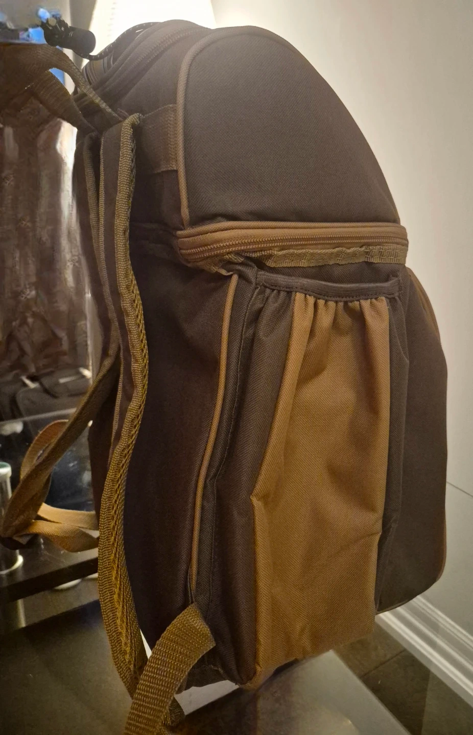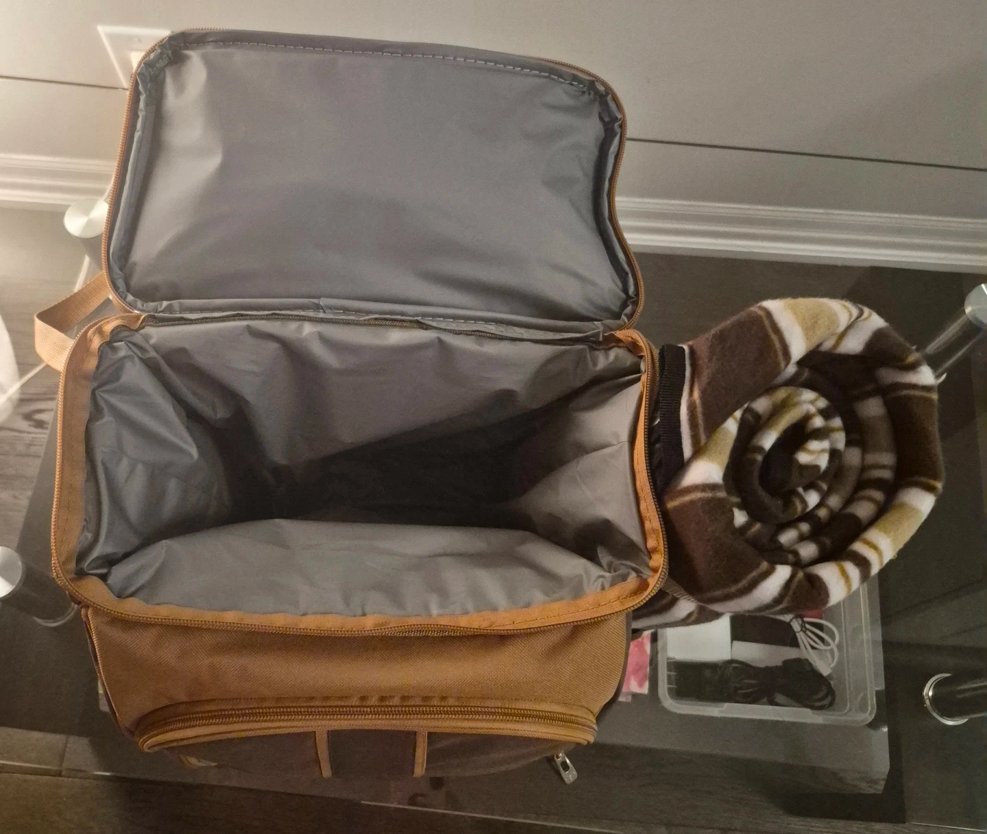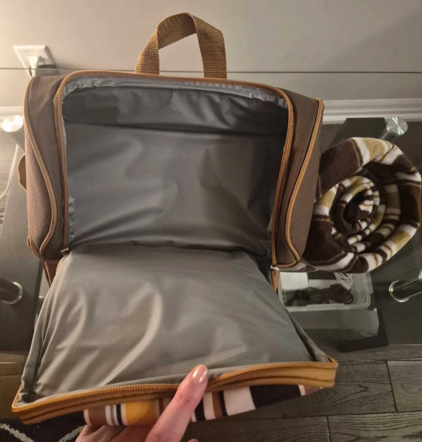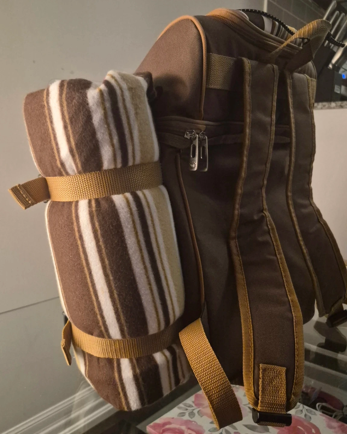 This Hap Tim picnic backpack has never been use. Is brown with striped accents. It includes a blanket, plates, cutlery, and glasses. It's perfect for outdoor adventures!