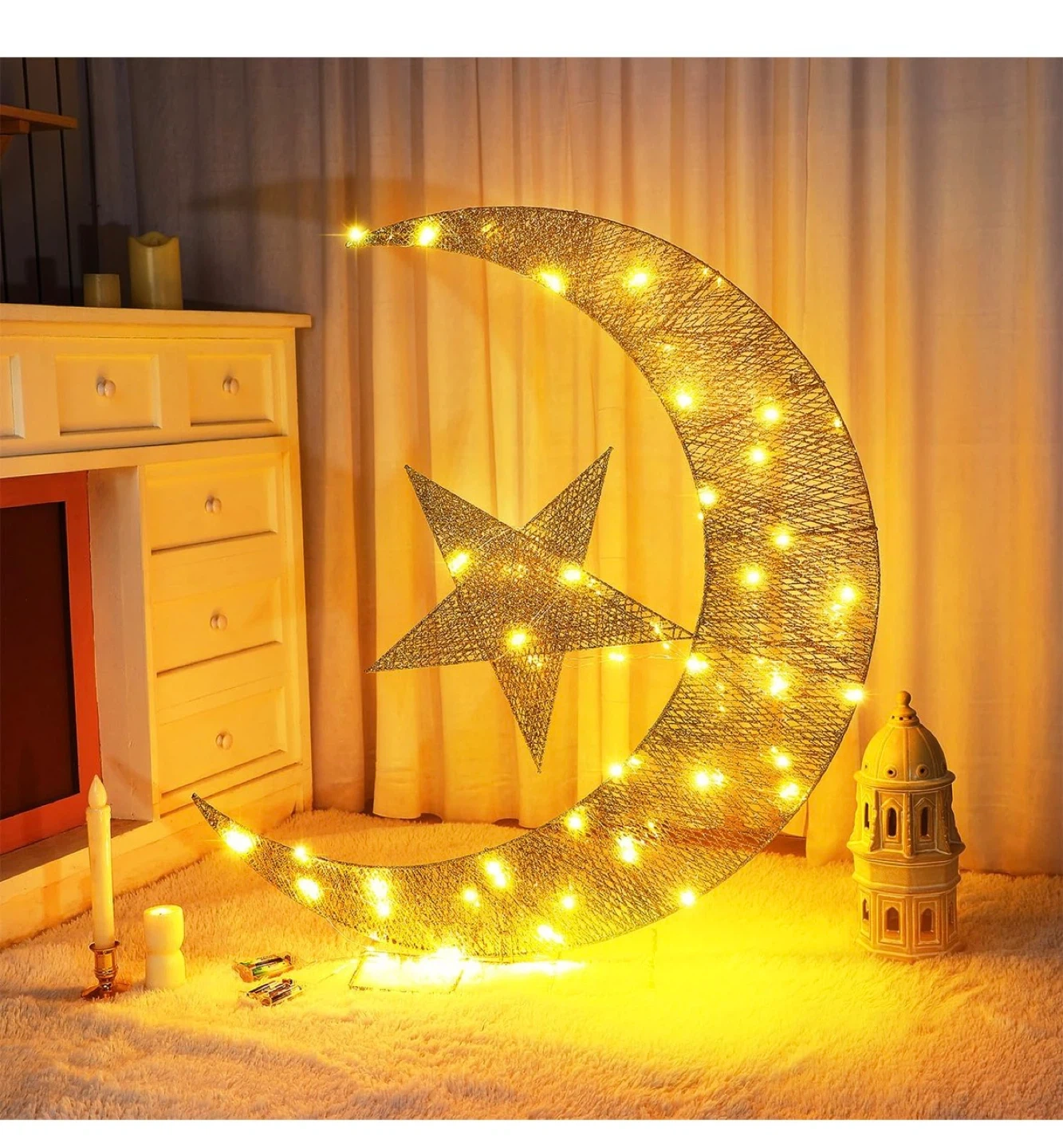 Pre-lit Ramadan Decorations for Home Metal Eid Star Moon Crescent Light Eid Mubarak Decorations Outdoor Lighted Night Lamp Sign with LED