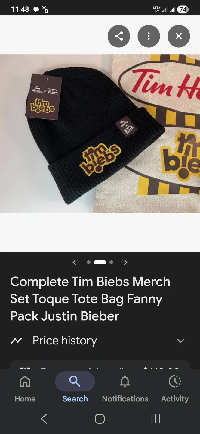 This Tim Hortons merch set features a black toque, a natural canvas tote bag, and a brown fanny pack, all with the 'Tim Bieb's' branding. It's a complete collection for fans of the collaboration. This set would be great for collectors or anyone looking for unique fan gear.
