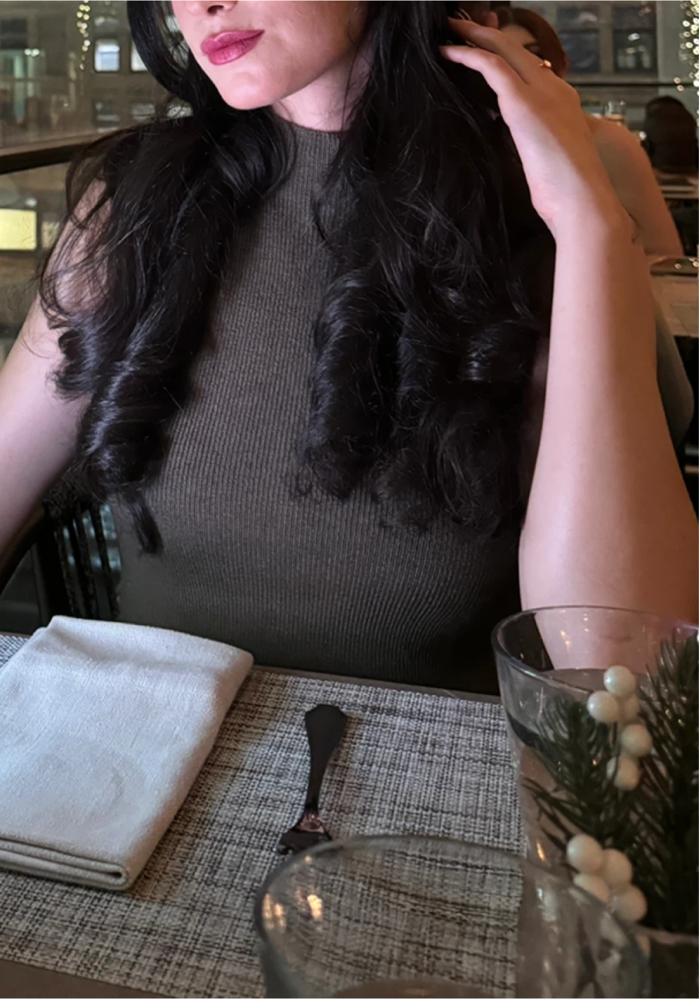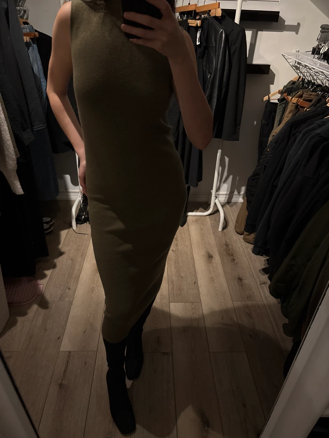 This Club Monaco sleeveless dress is made from a merino wool blend. It features a mock neck and a ribbed knit design. Size is XS/TP. Olive Green color. Excellent for layering or wearing on its own!