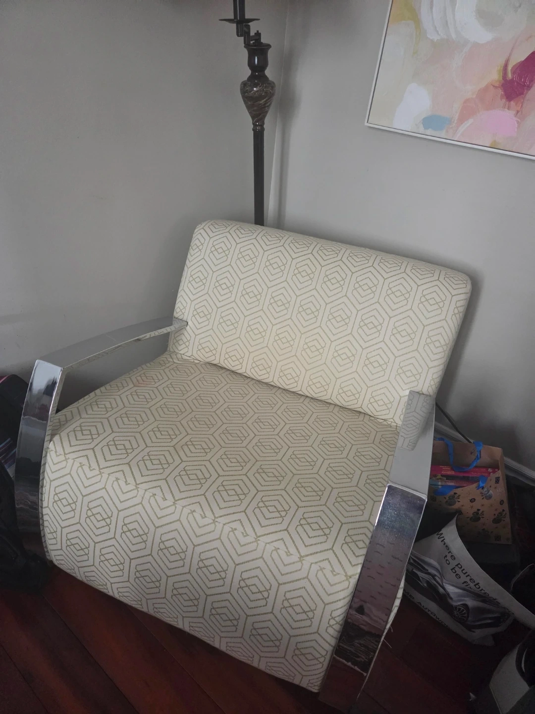 Stylish accent chair featuring a repeating geometric pattern in beige and gold. It has sleek chrome arms and a sturdy frame. Adds a touch of modern elegance to any room!