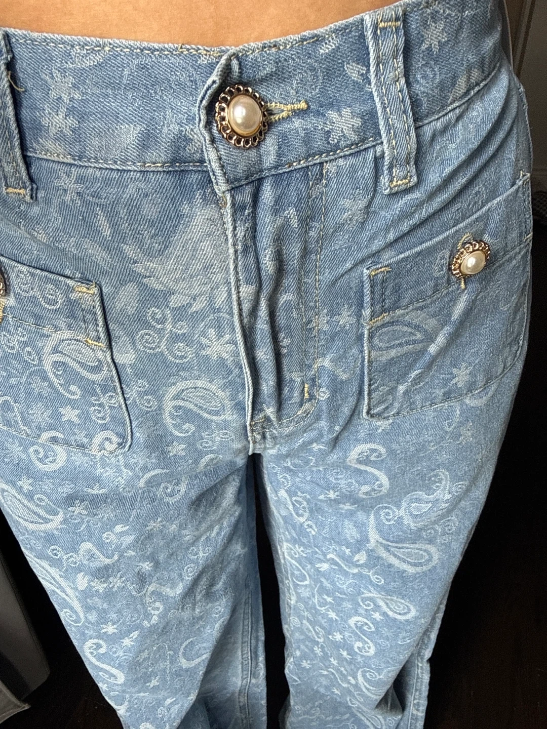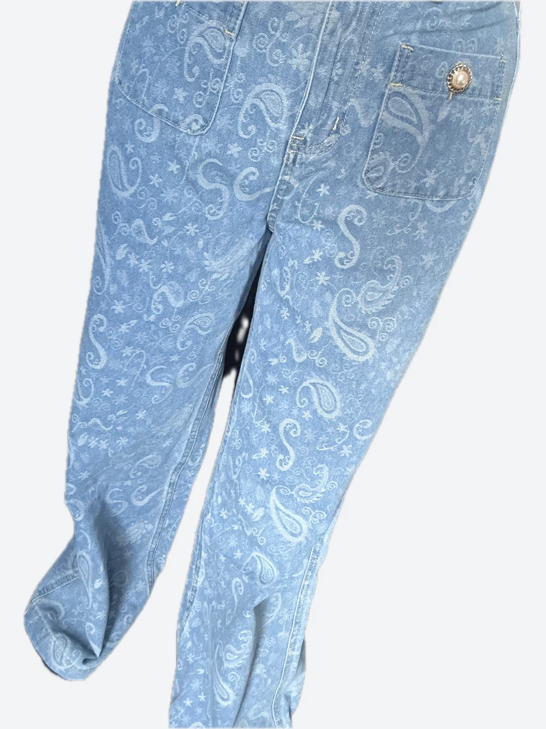 Light wash denim jeans featuring a subtle all-over paisley print. They have a classic five-pocket design with decorative pearl and gold button accents. These jeans offer a unique vintage-inspired look.