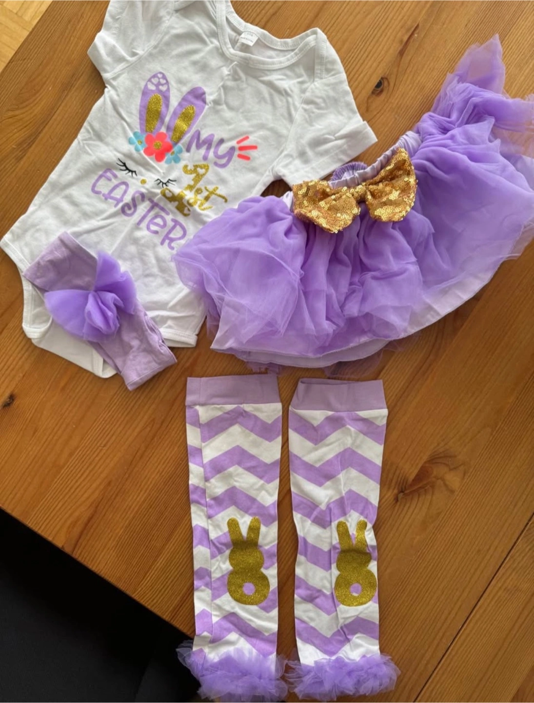 Precious baby girl's Easter outfit. Includes bodysuit, tutu skirt, and leg warmers. Purple and gold theme. Perfect for photos! Never worn/never washed but no tags.