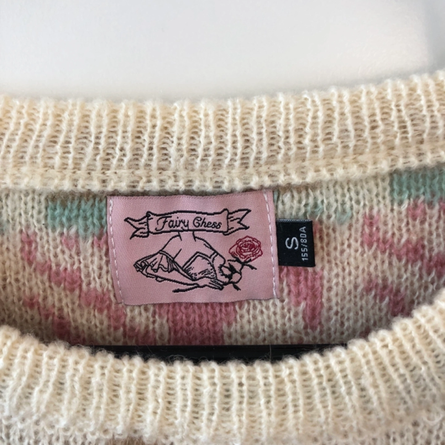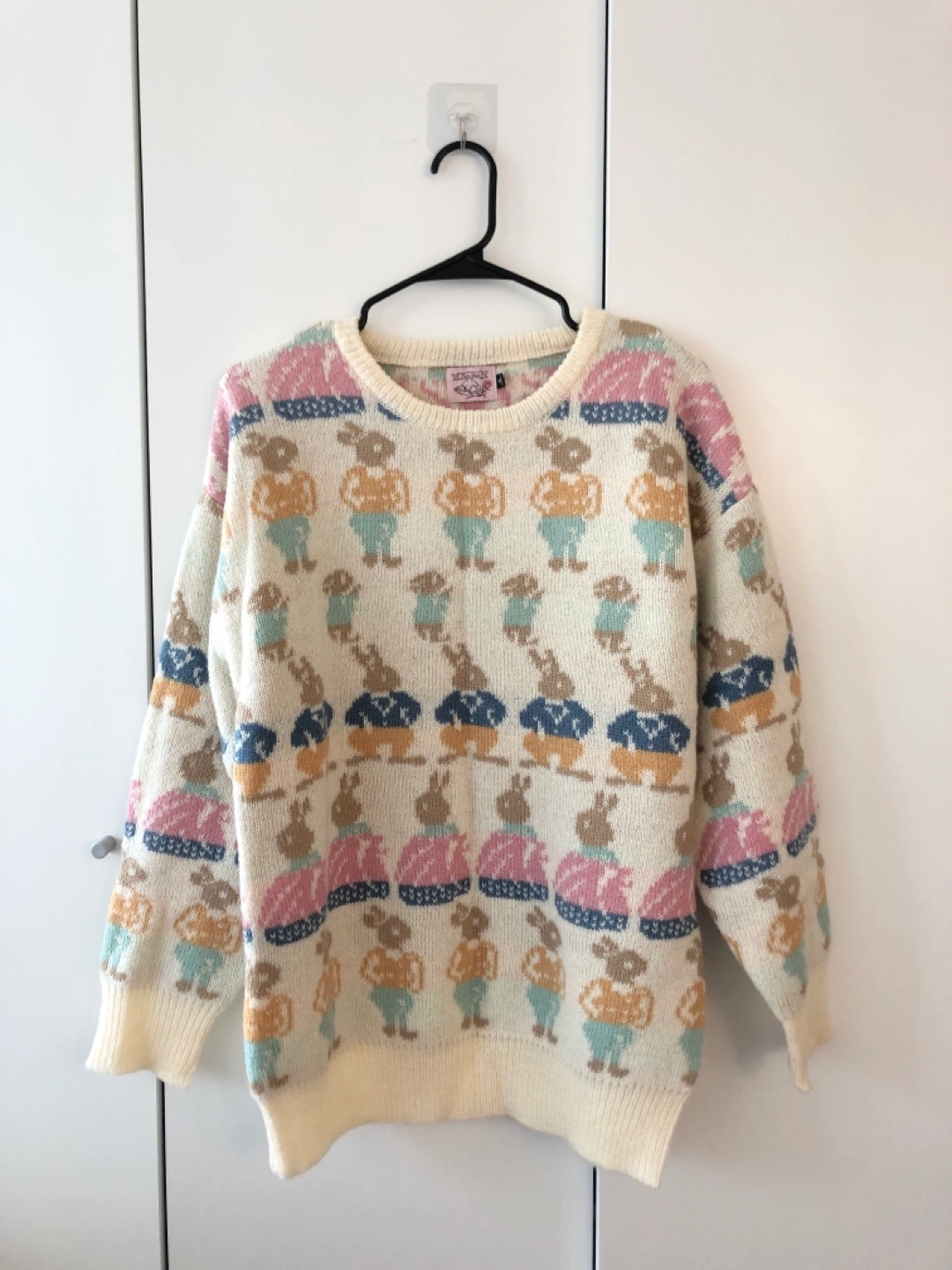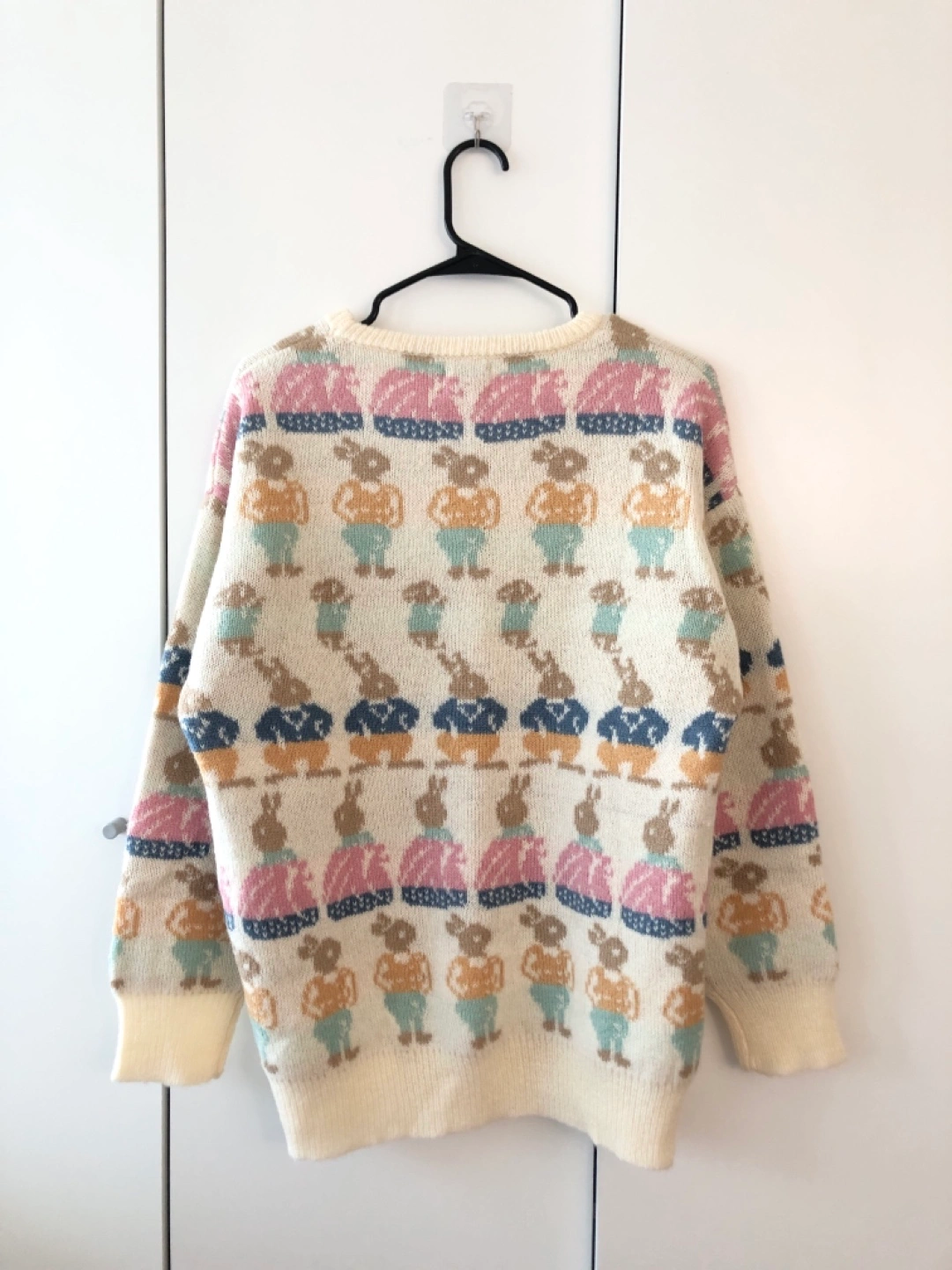 169Cream-coloured knit sweater. Features an all-over pattern of pastel bunnies. Long sleeves, crew neck. Size small. vintage style
