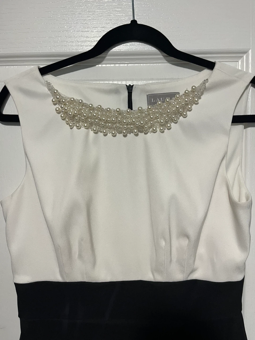 This is a Laura dress, size 6. It features a white top with pearl and bead embellishments around the neckline, and a black layered skirt. The dress has a hidden back zipper closure.