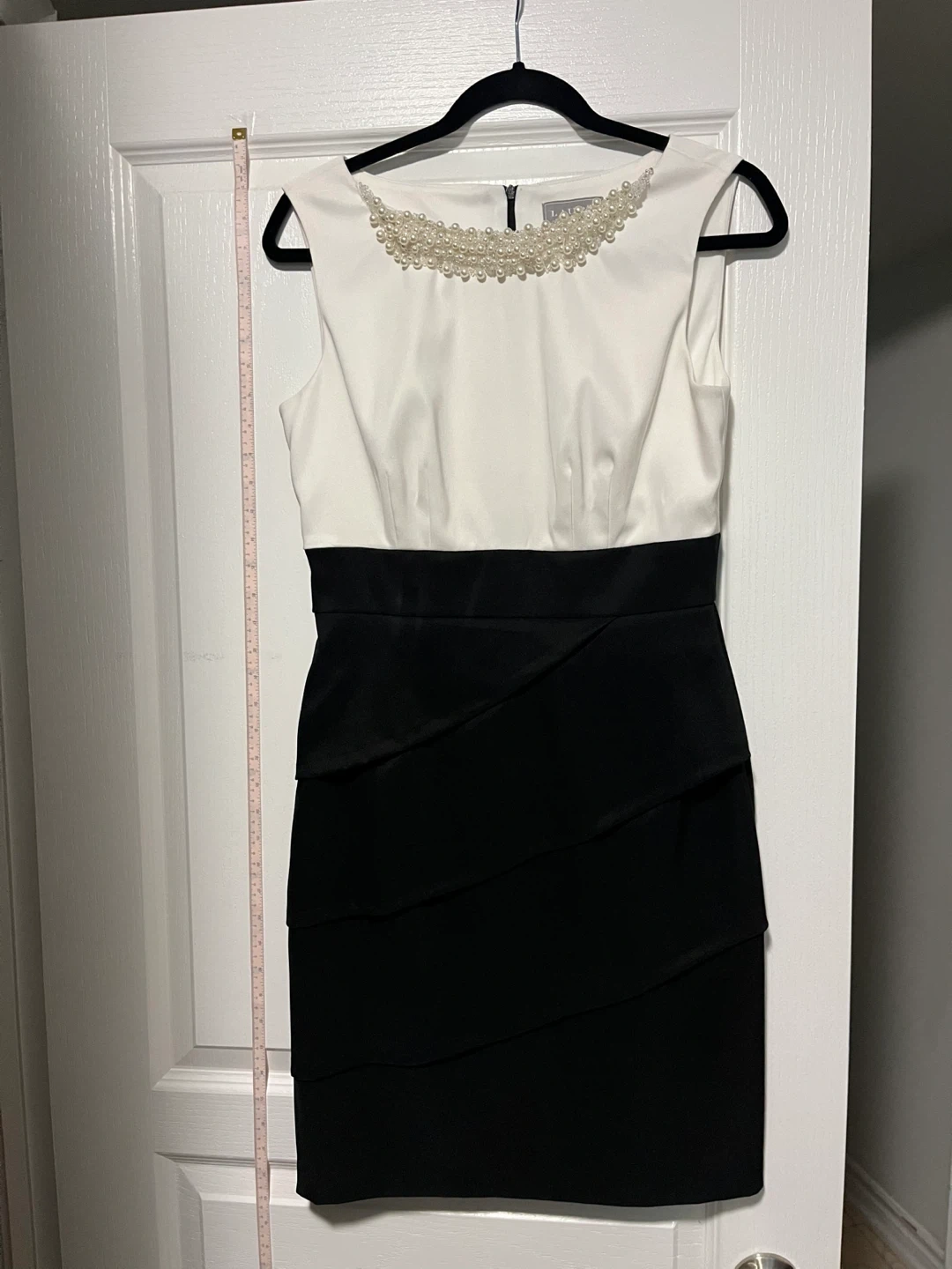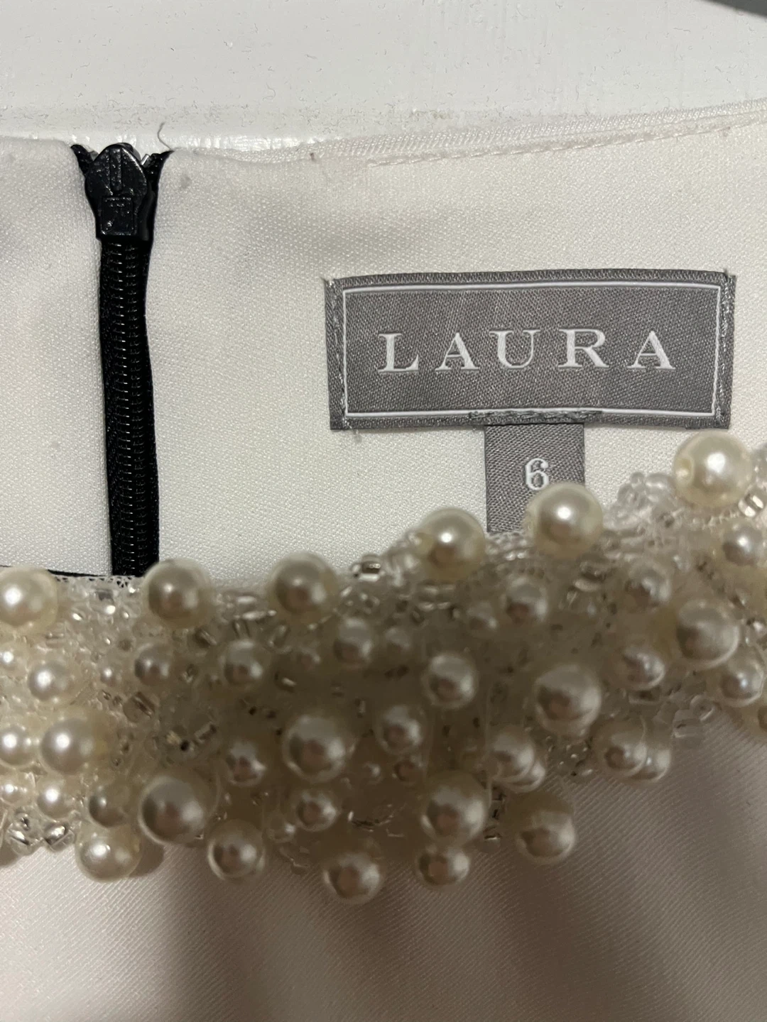 This is a Laura dress, size 6. It features a white top with pearl and bead embellishments around the neckline, and a black layered skirt. The dress has a hidden back zipper closure.