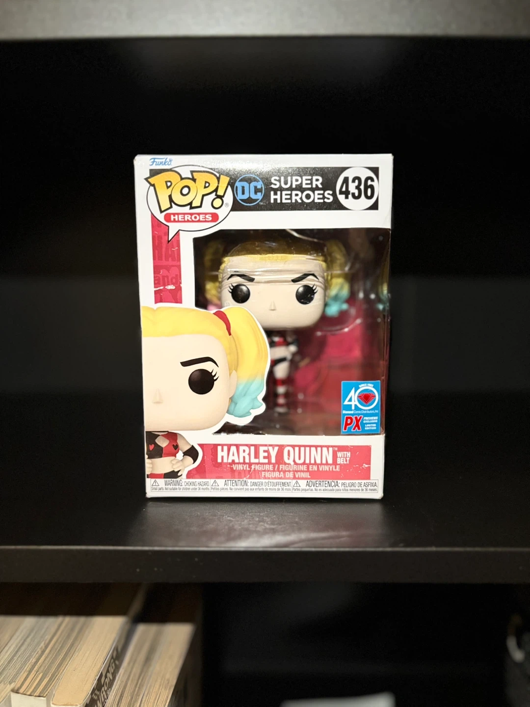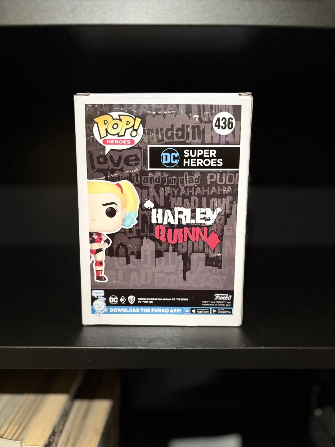 This is a Funko Pop! DC Heroes collectible vinyl figure of Harley Quinn, number 436. It's part of the Super Heroes line. The figure comes in its original box.