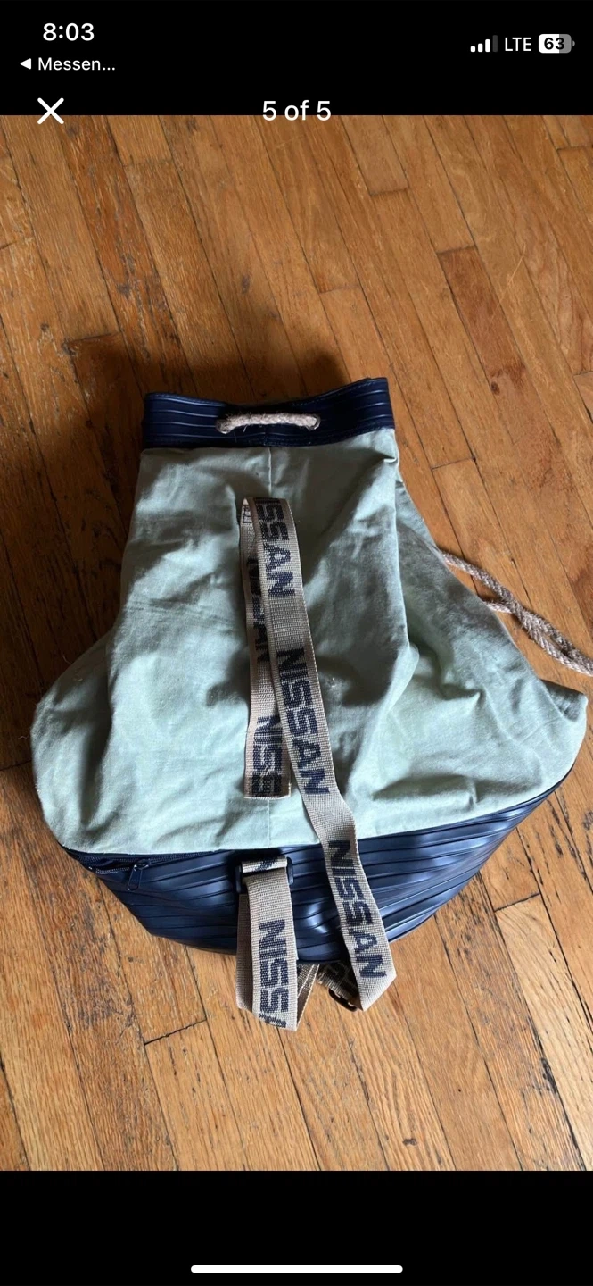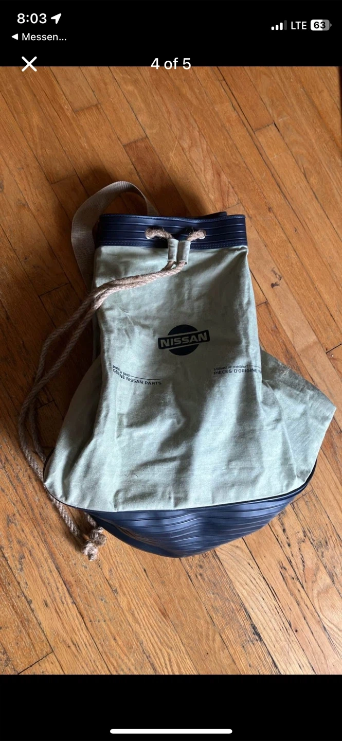Here's a drawstring bag with the Nissan logo on it. It has a unique design with the Nissan logo on the front and straps. The bag is in good condition and ready for use!