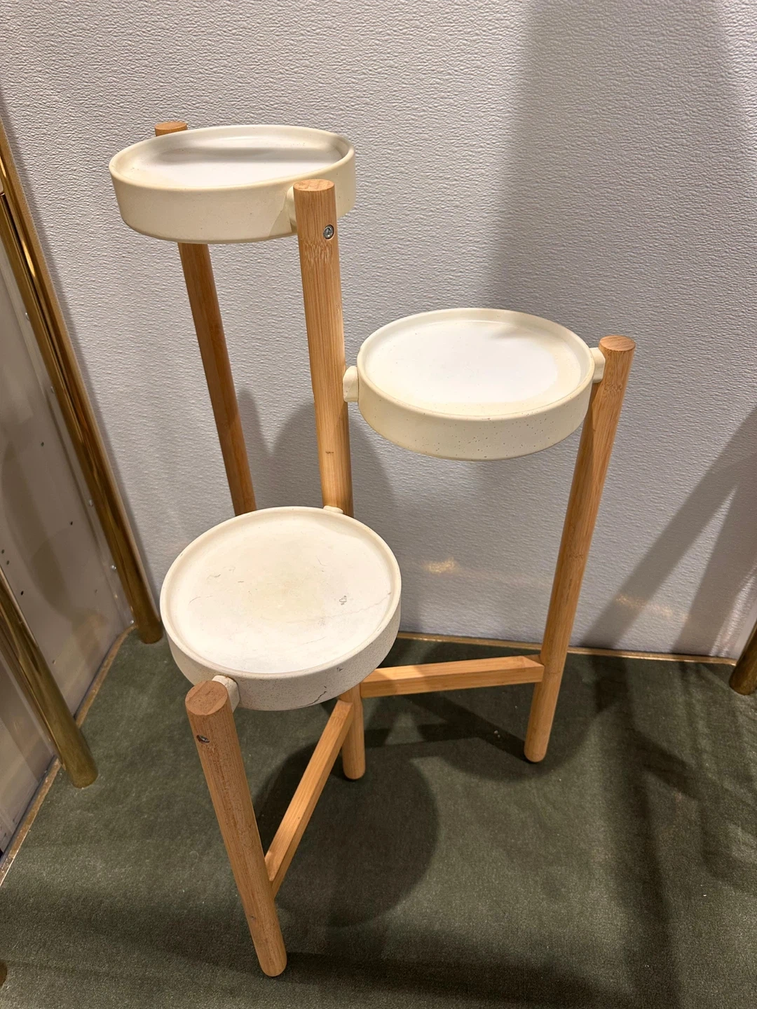 This 3-tier plant stand features a modern design with ceramic trays and a natural wood frame. It's perfect for displaying your favourite plants indoors or on a covered patio. The tiered structure maximizes vertical space.