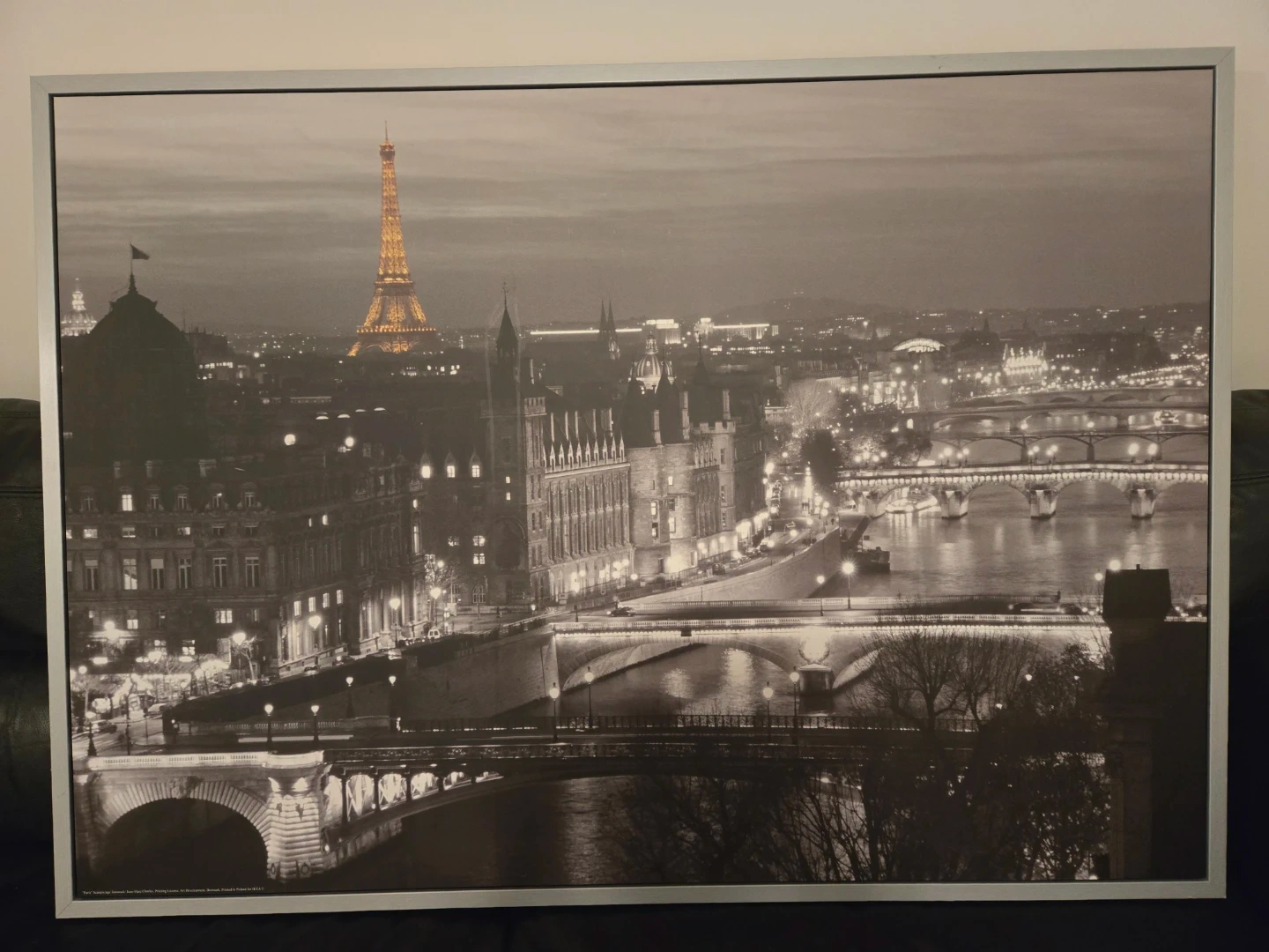 Framed print of a cityscape featuring the Eiffel Tower and Seine River in Paris. The print is in black and white with the Eiffel Tower lit up. Perfect for adding a touch of Parisian charm to your home decor