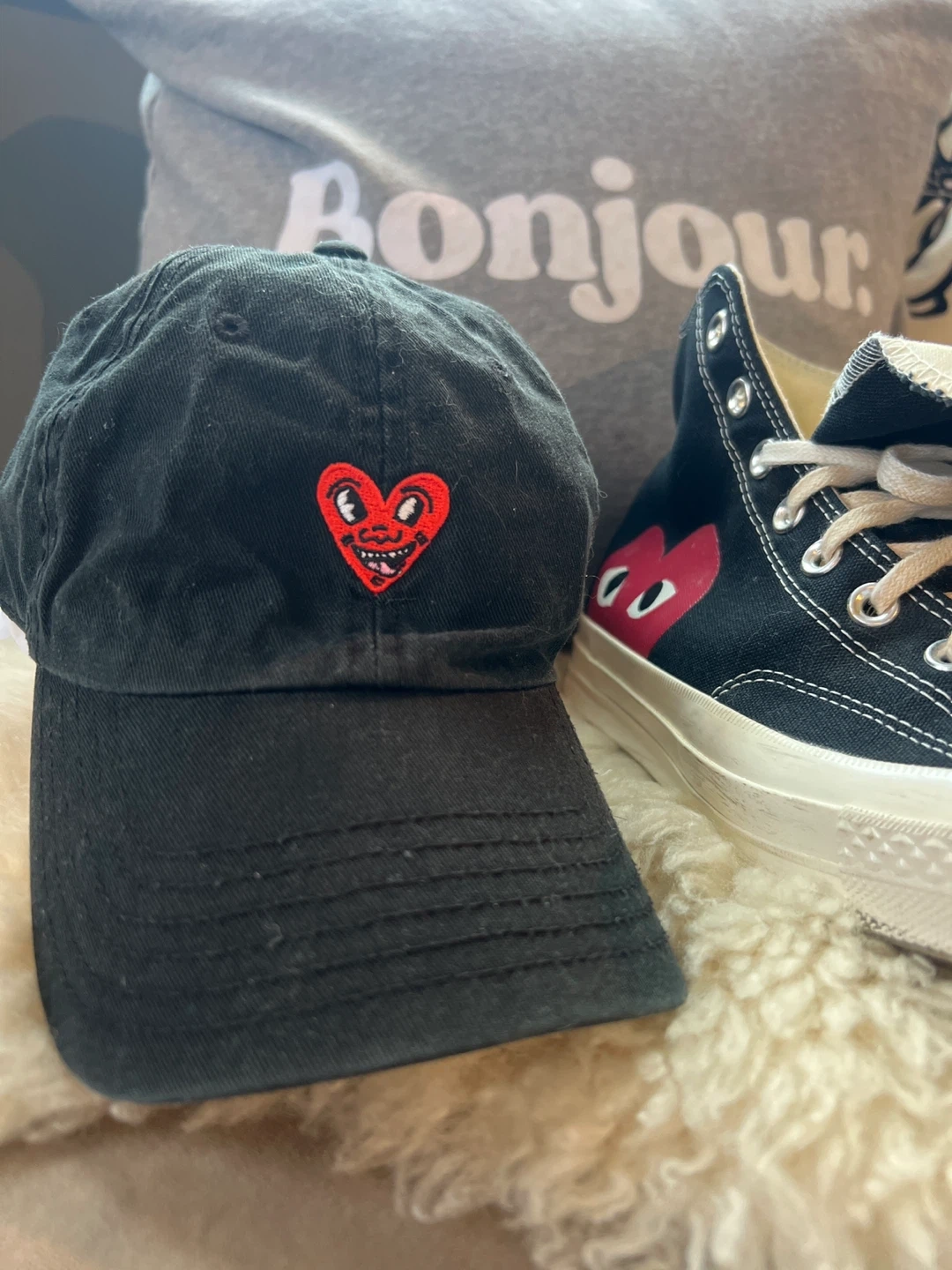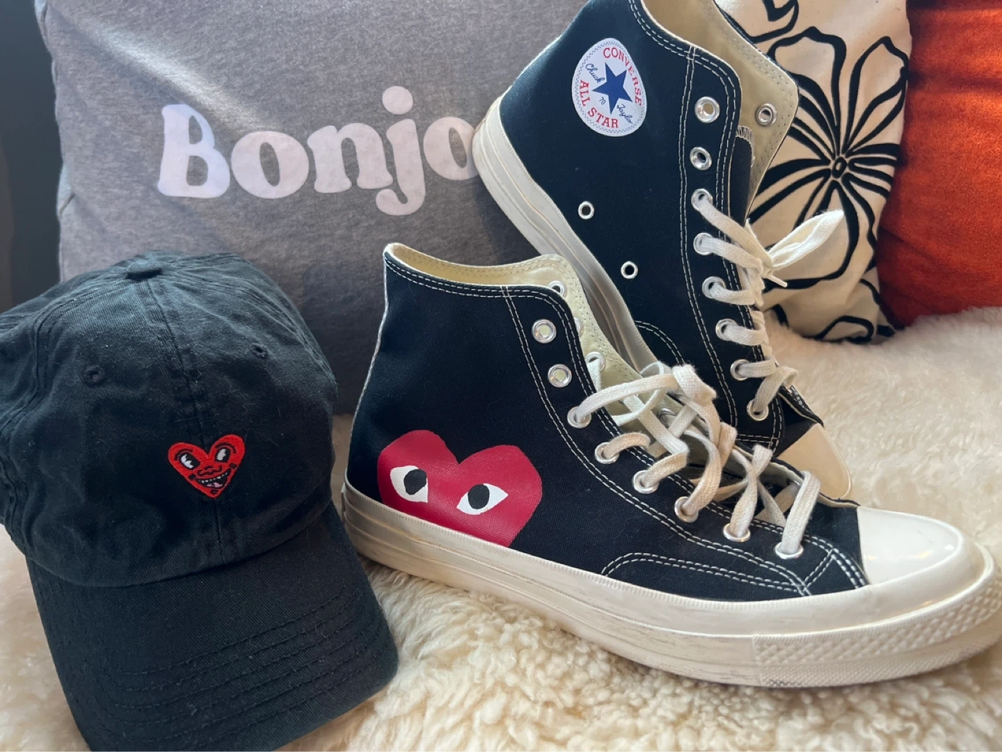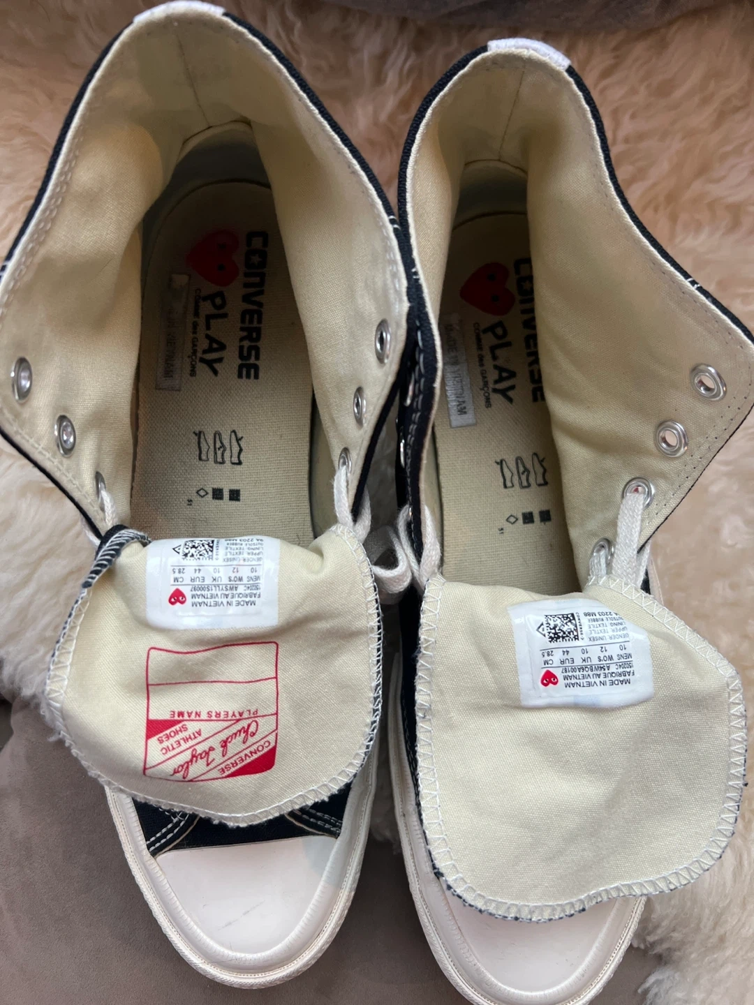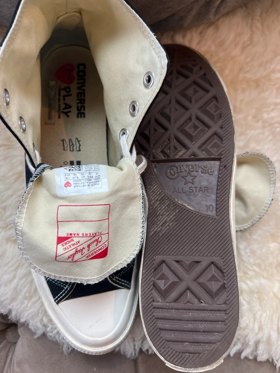 Worn once, Converse Comme Des Garcon Black hightops! With the signature Comme des Garçons PLAY red heart logo. Features Chuck Taylor branding on the tongue and Converse All Star logo on the side. Size 10.