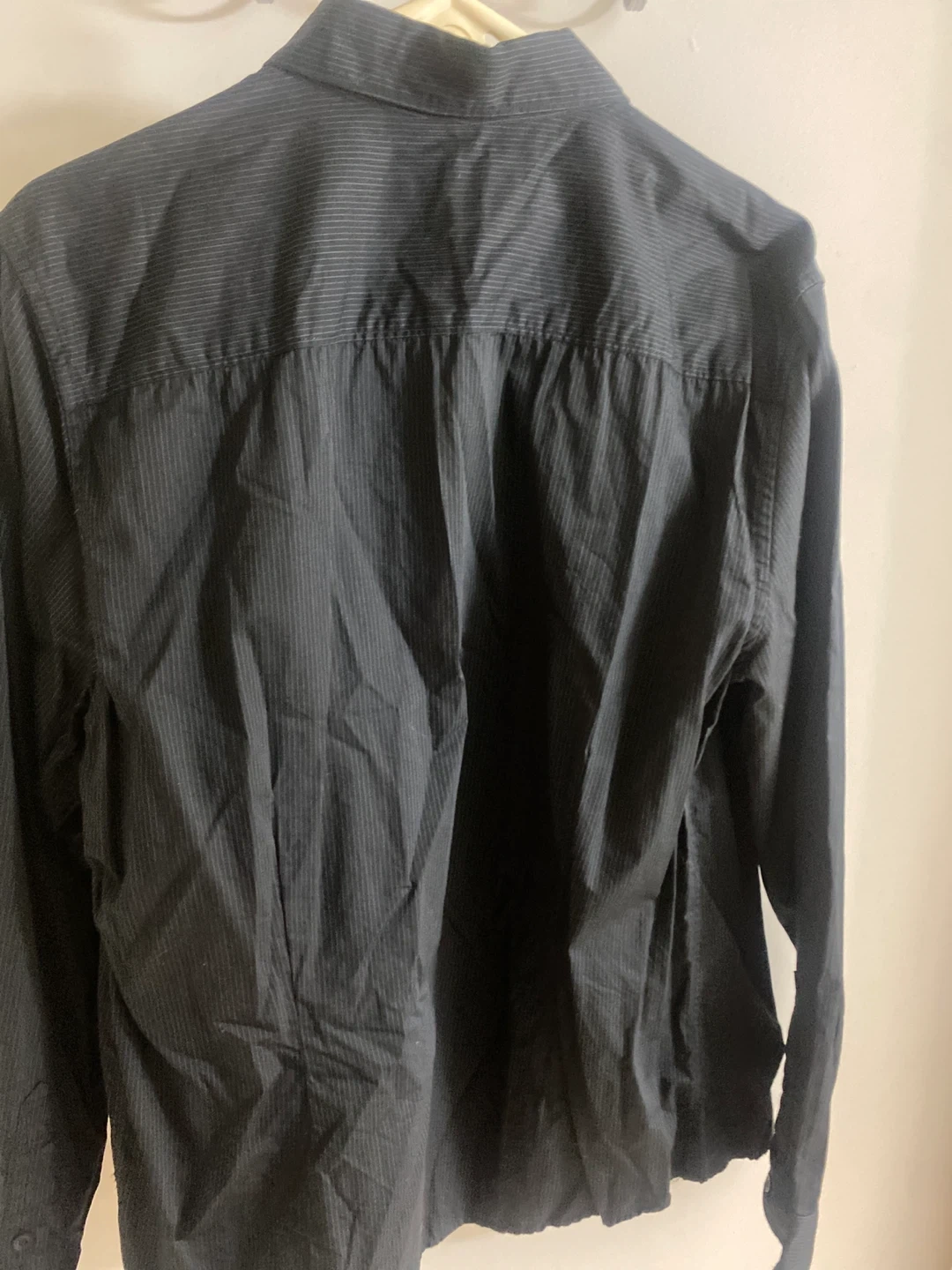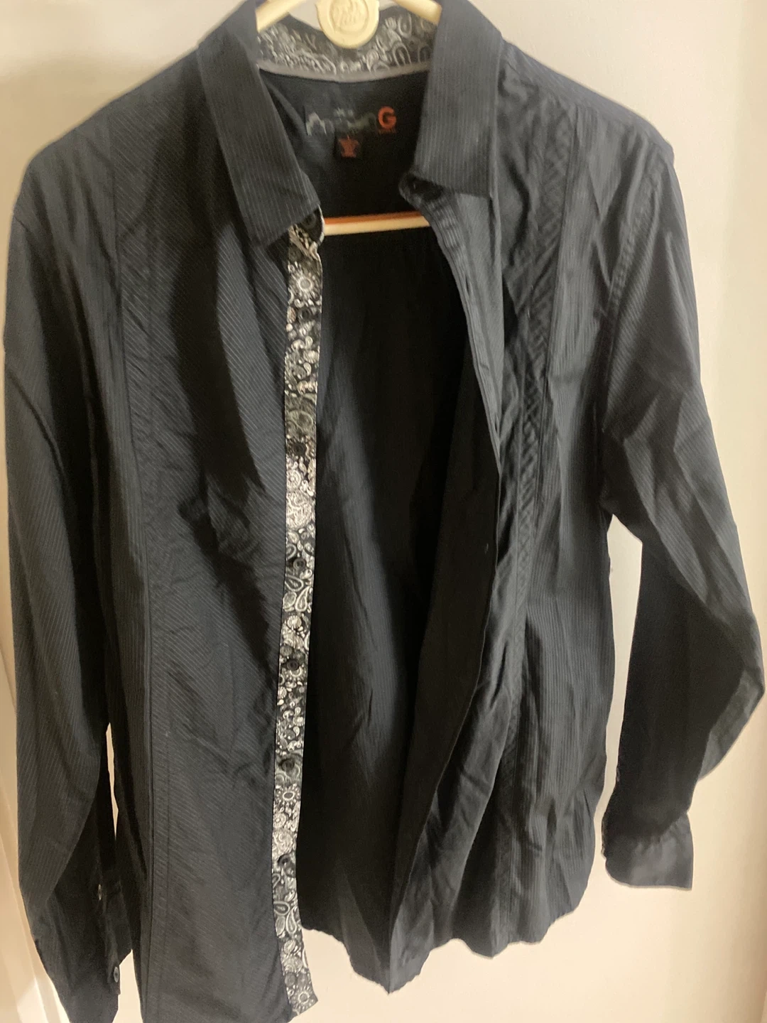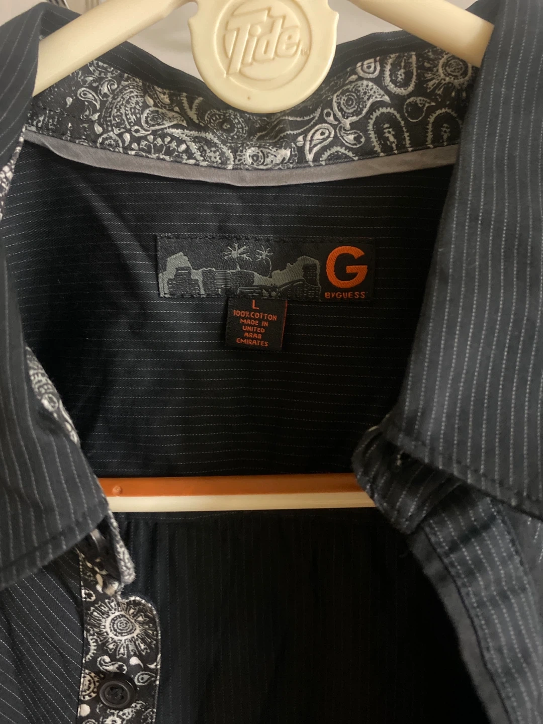 Selling a G by Guess button-down shirt in size L. It's a stylish black color with a subtle striped pattern. The shirt is made of 100% cotton, making it comfortable to wear. Perfect for a casual or semi-formal look!