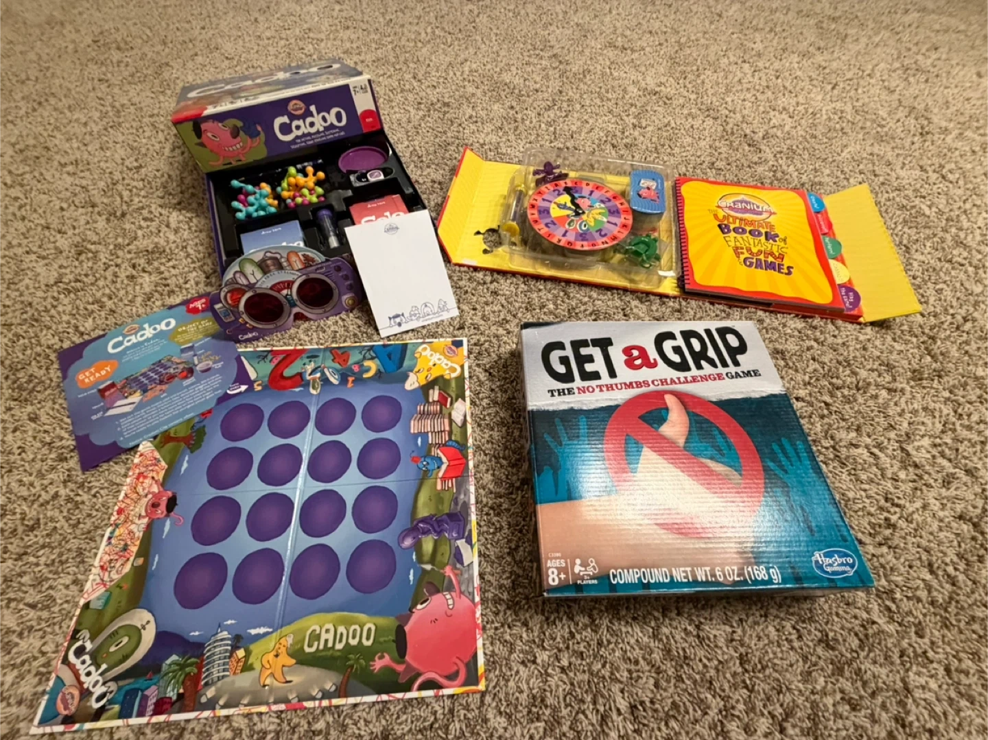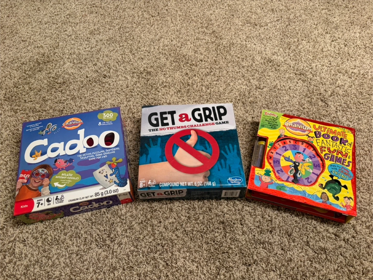 Here we have 3 board games for kids. Cranium Cadoo the acting, puzzling, sketching, sculpting, code-cracking game for kids, Get A Grip, and Cranium Ultimate Book of Fantastic Fun & Games.