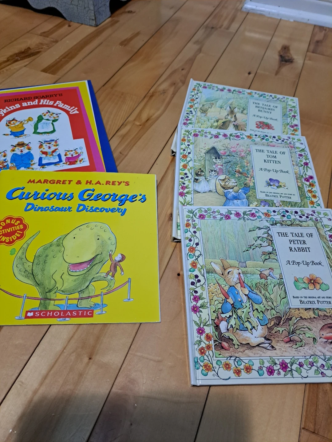 Collection of Usborne Internet-linked First Encyclopedia of Seas & Oceans and First Encyclopedia of Animals. Also includes Beatrix Potter pop-up books and Curious George's Dinosaur Discovery. These books are great for engaging young readers with educational and fun content.