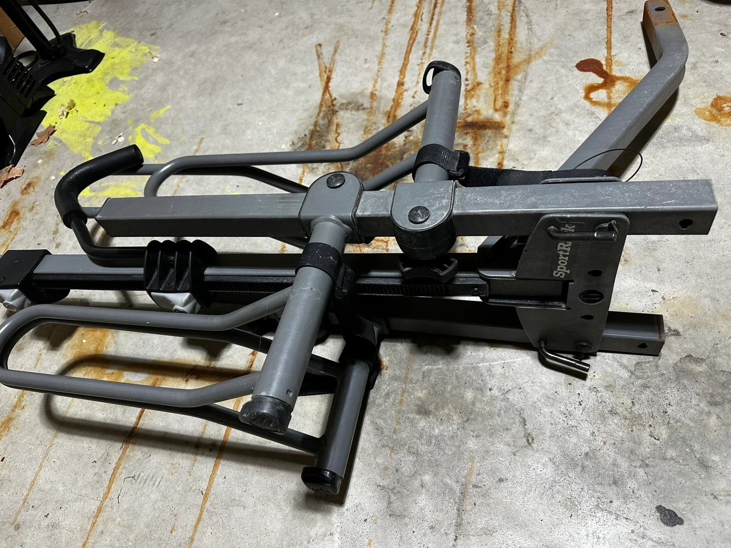 SportRack hitch-mounted bike rack for transporting your bicycle. It's made of metal and has adjustable straps for securing the bike. This rack attaches to your vehicle's hitch receiver.